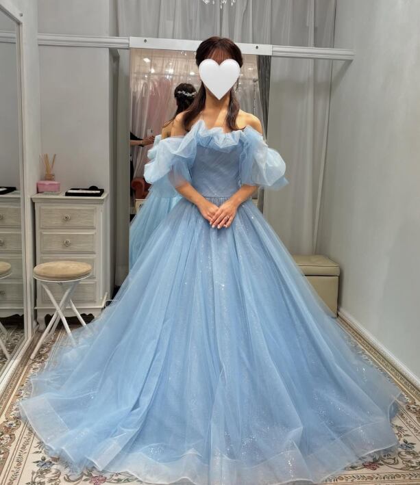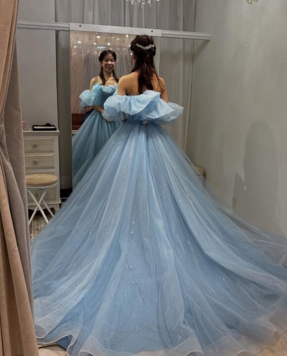 カラードレス 爽やかで優しいブルー シークインチュール 華やかなトレーン ブライダル