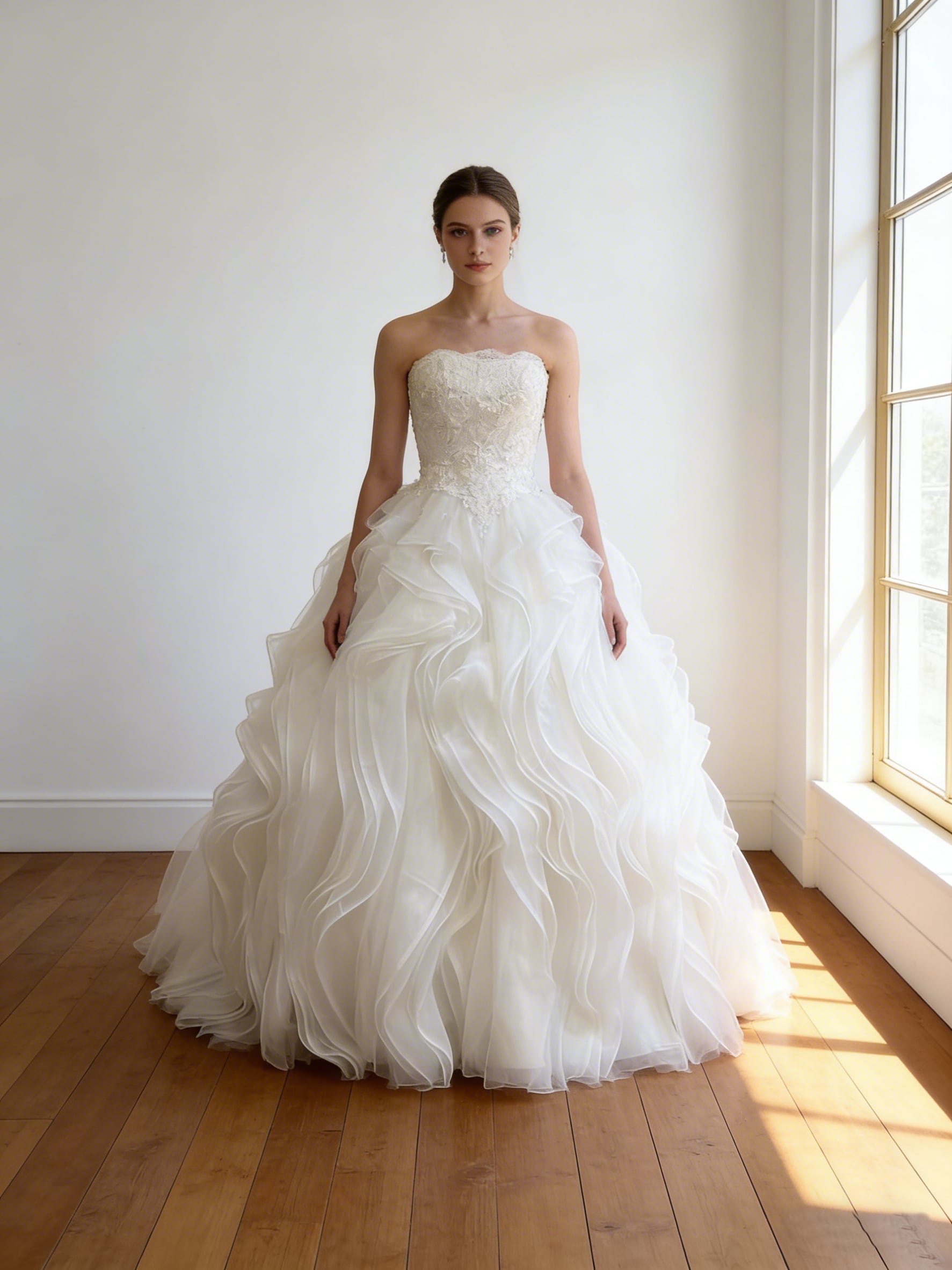 ウエディングドレス オフホワイト ビスチェドレス ラッフルフリル トレーン 結婚式 ブライダル