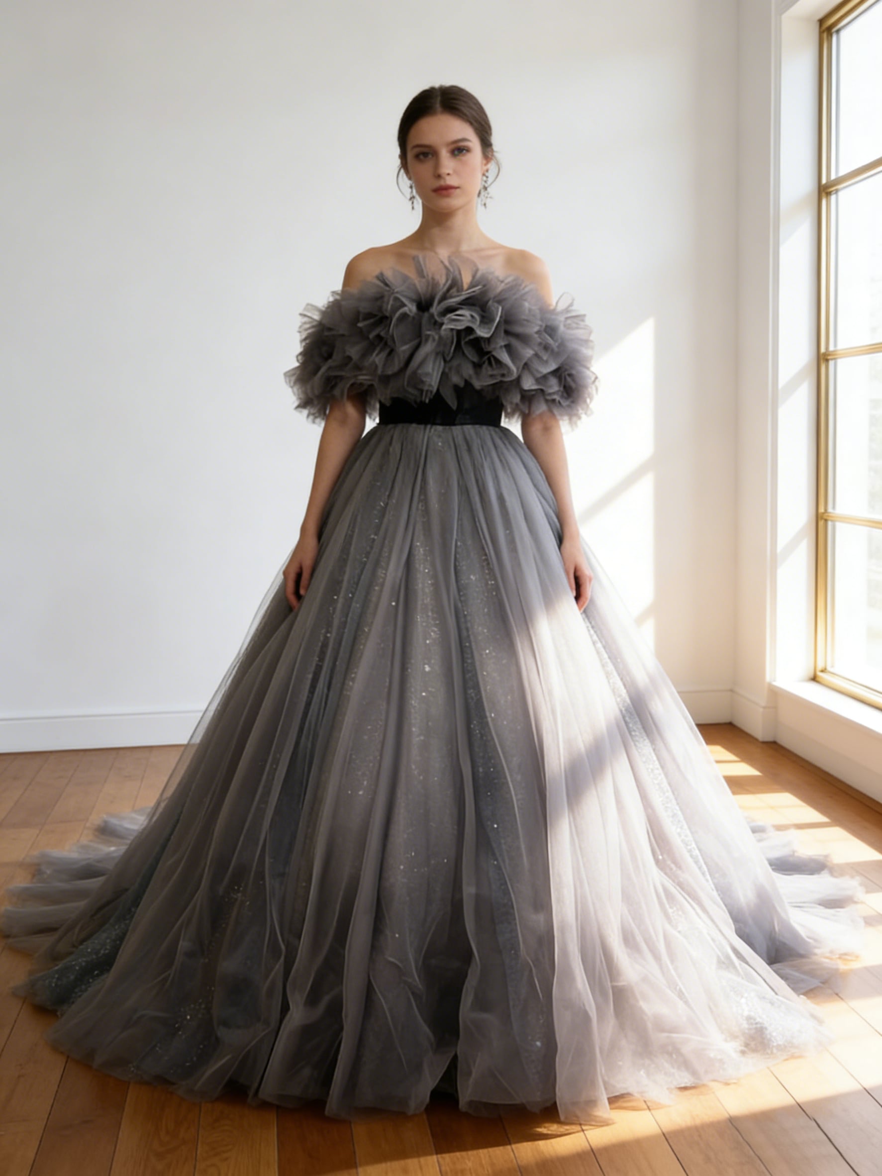 カラードレス シルバーグレー オフショルダー シークインチュール サッシュベルト 華やかなトレーン 花嫁