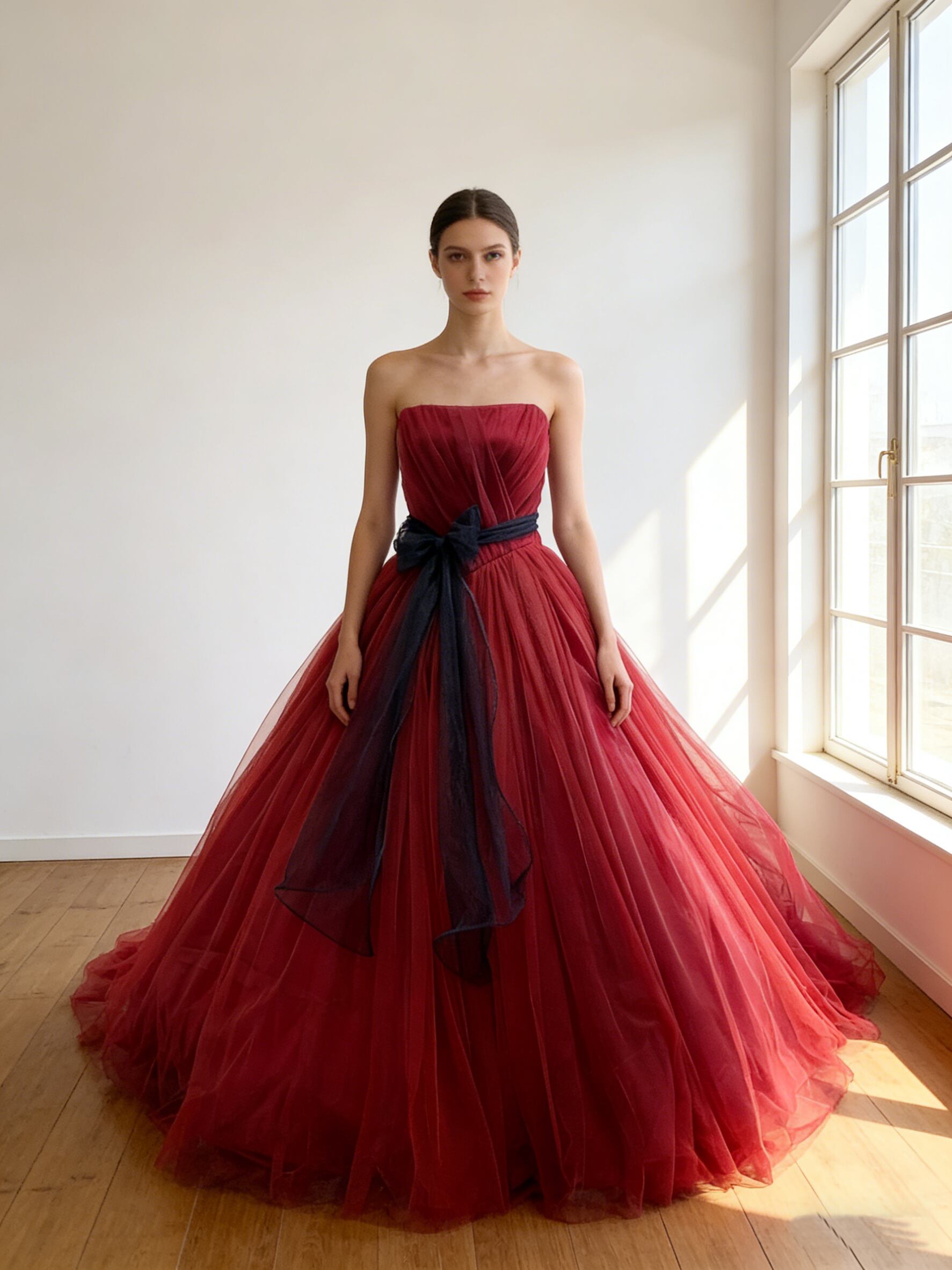 カラードレス ボルドー色 サッシュベルト ソフトチュール ロングトレーン 花嫁 前撮り 色直し