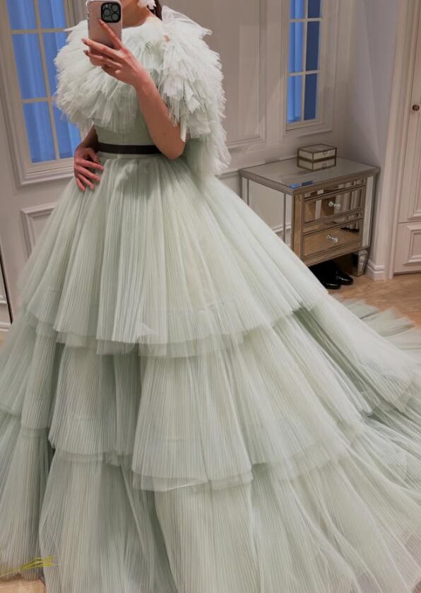 カラードレス ミントグリーンドレス オフショルダー サッシュベルト ボリュームドレス ロングトレーン 花嫁