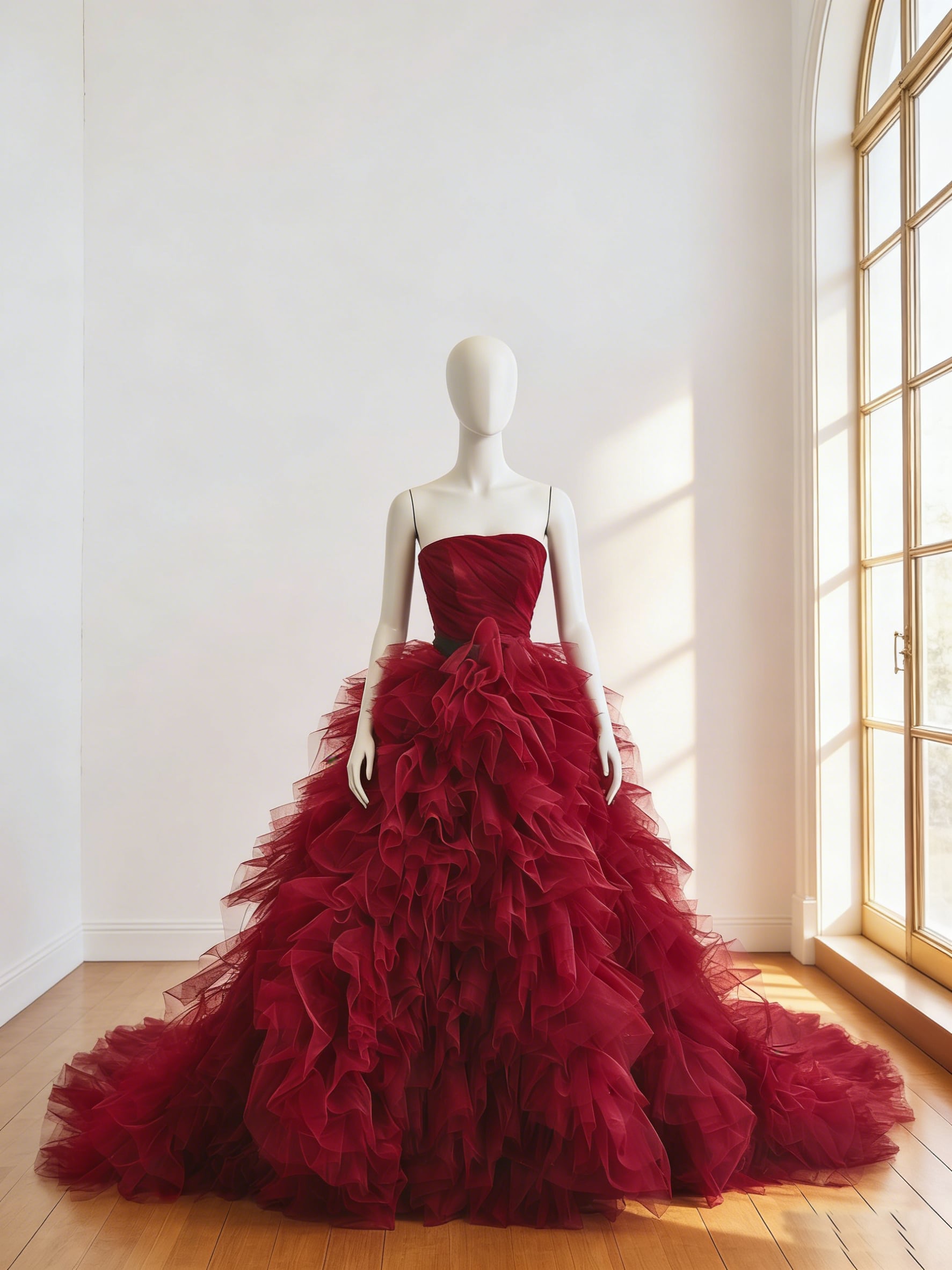 カラードレス ボルドー色 ビスチェドレス もこもこドレス 華やかなトレーン 編み上げ 花嫁 前撮り