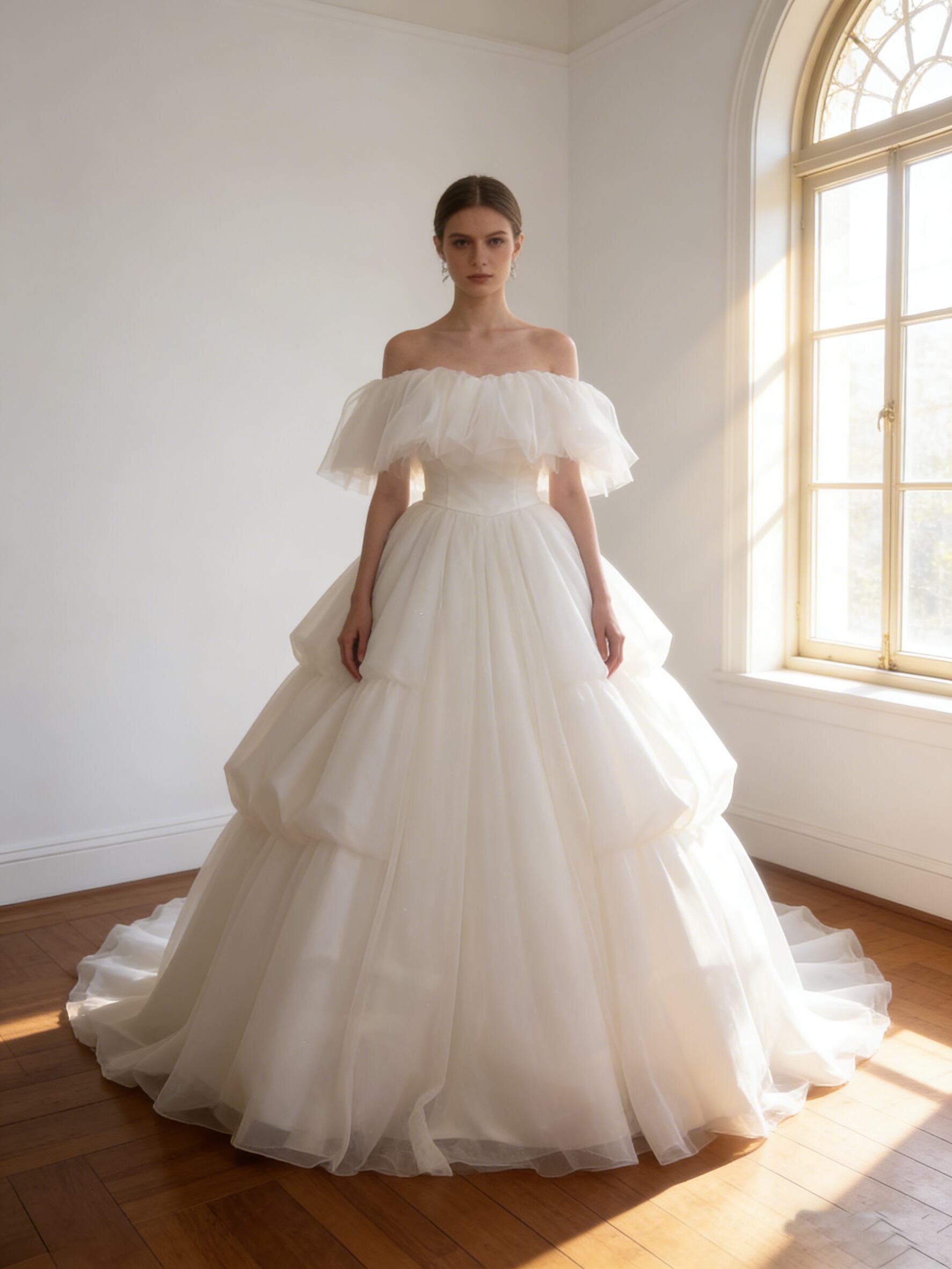 ウエディングドレス オフホワイト オフショルダー ソフトチュール 編み上げ 華やかなトレーン ブライダル