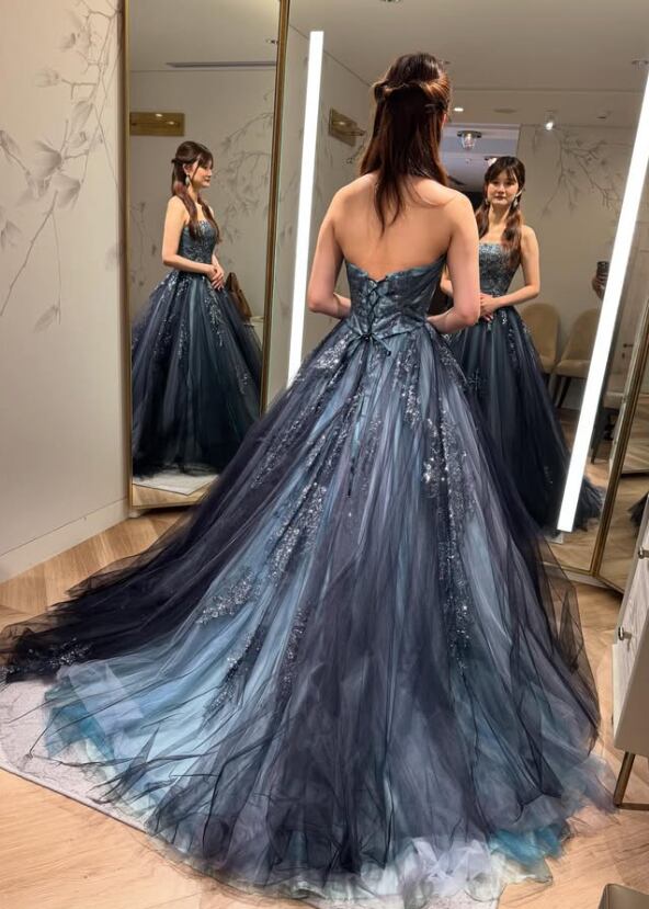 カラードレス ネイビー ビスチェドレス 繊細なレース ビスチェドレス ソフトチュール 音楽会