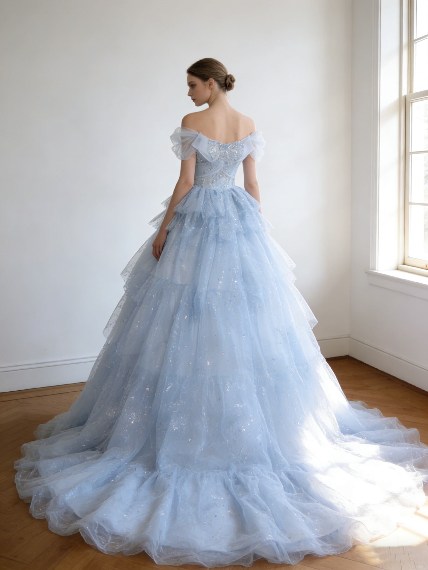 カラードレス 爽やかで優しいブルー オフショルダー キラキラ光る刺繍 シークインチュール ブライダル