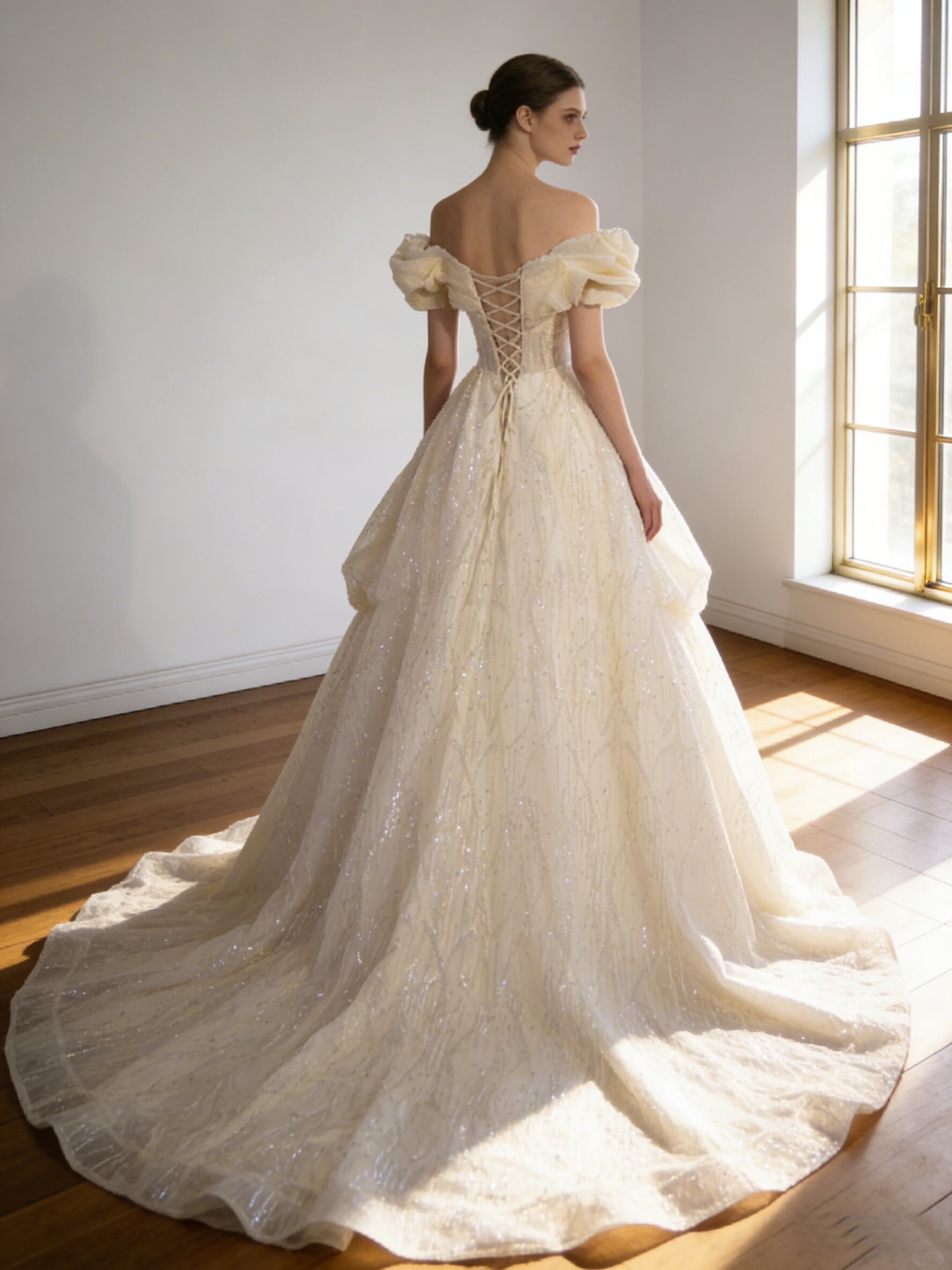 ウエディングドレス オフホワイト オフショルダー 編み上げ キラキラ光る刺繍 韓国風ドレス 披露宴/結婚式