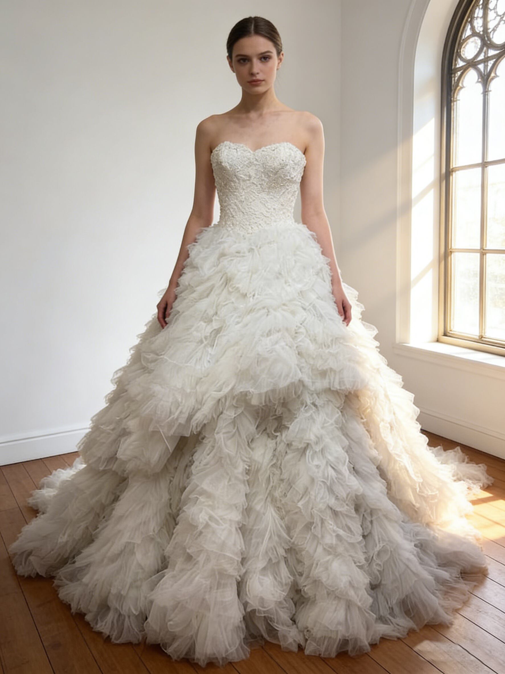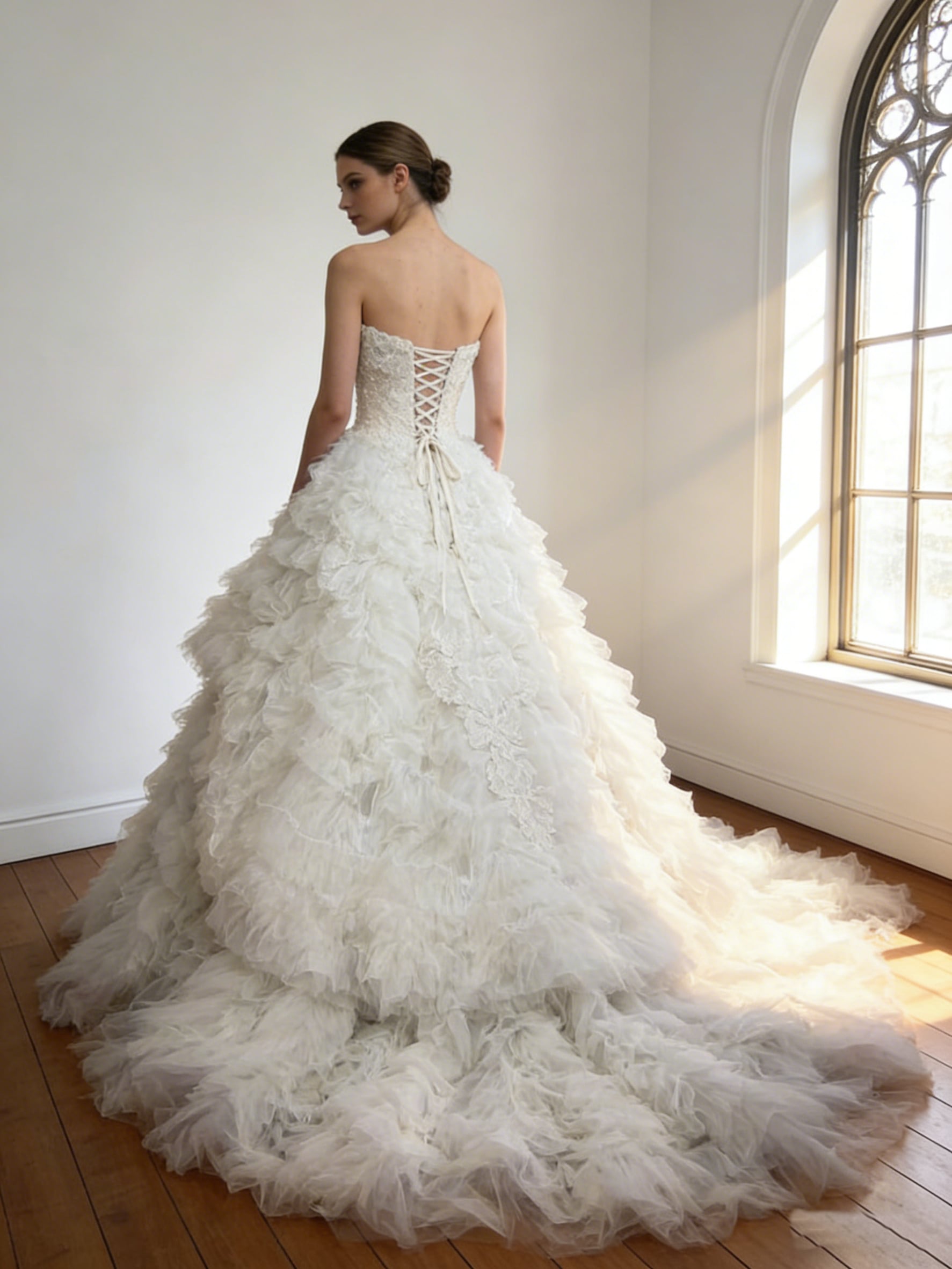 ウエディングドレス オフホワイトもこもこドレス ビスチェドレス 華やかなトレーン 編み上げ ブライダル