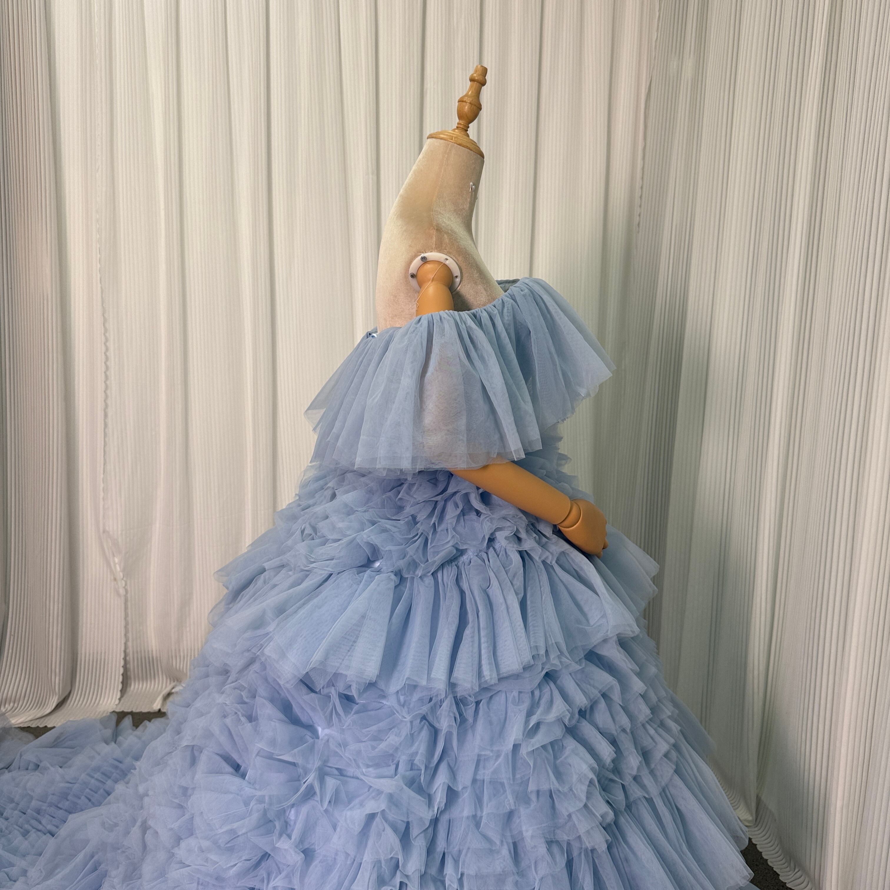 カラードレス ブルー オフショルダー ソフトチュール 華やかなトレーン 花嫁 前撮り