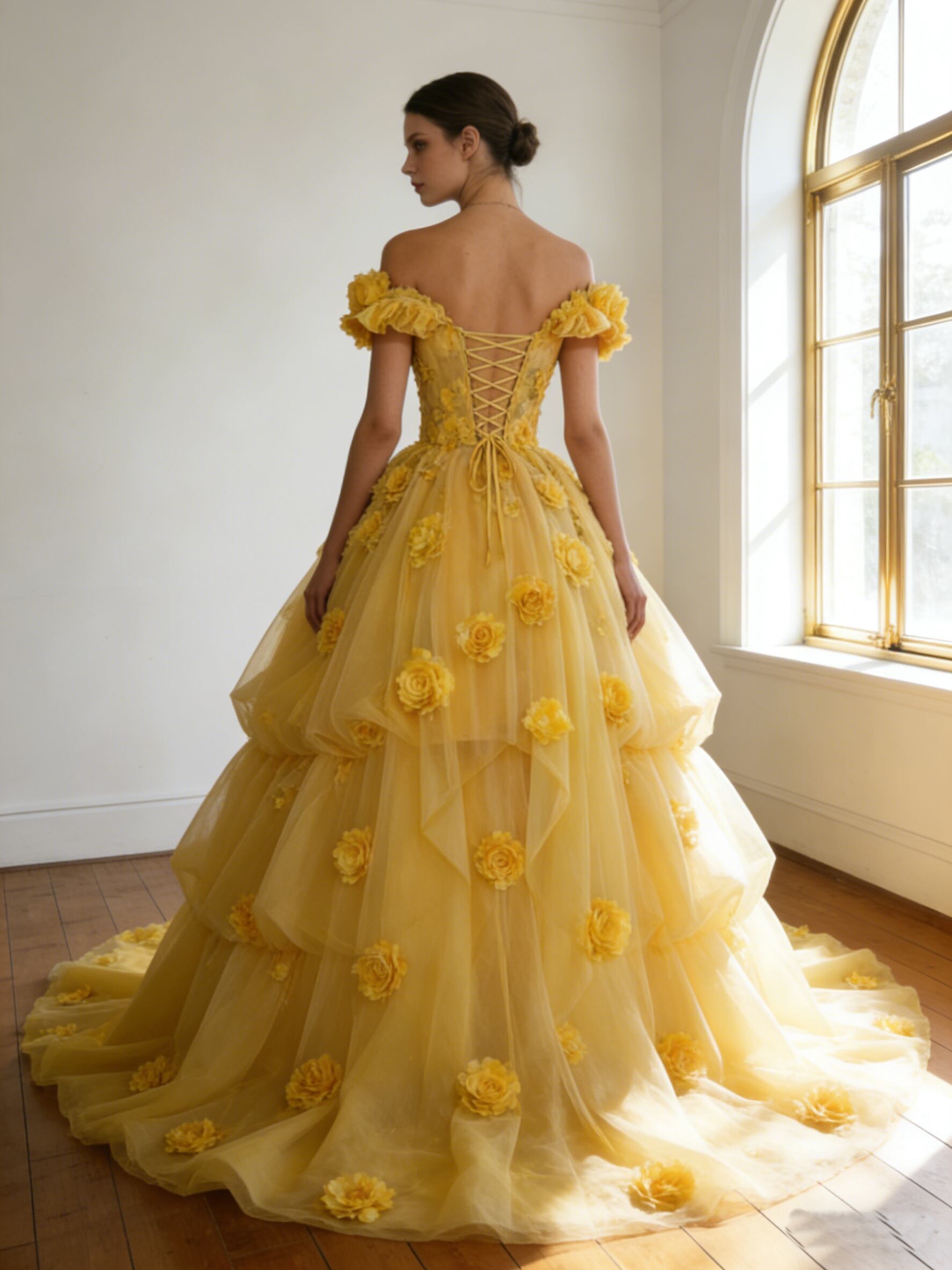 カラードレス 黄色い フリルオフショルダー フィッシュテール バラトレーン 華やかなトレーン 編み上げ 結婚式
