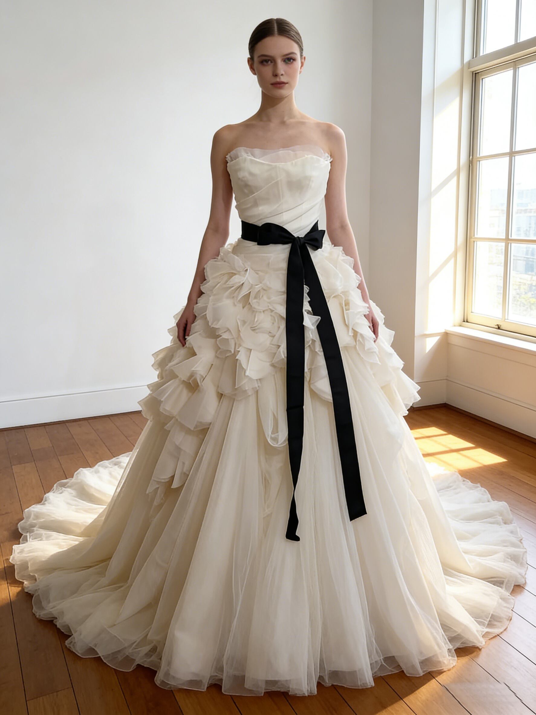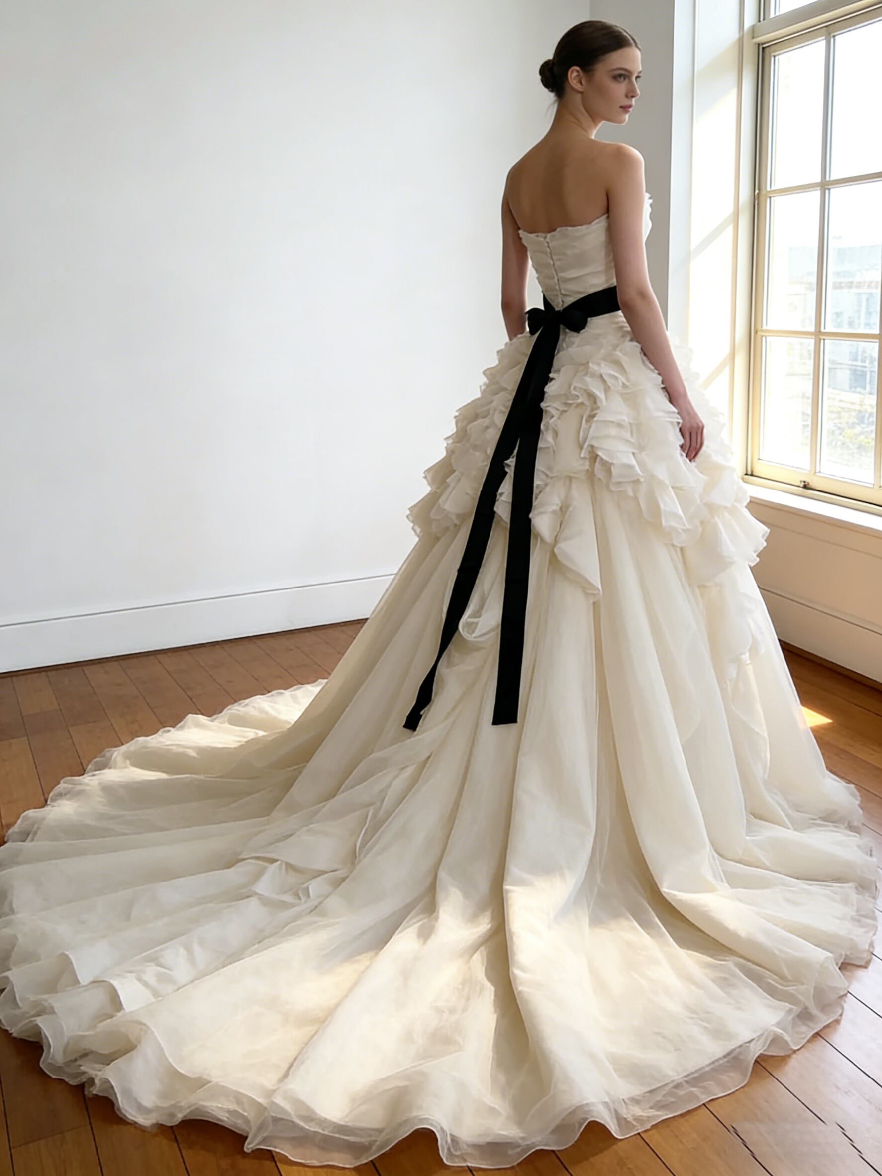 ウエディングドレス オフホワイト サッシュベルト ウェーブ スリット 華やかなトレーン ビスチェドレス 花嫁