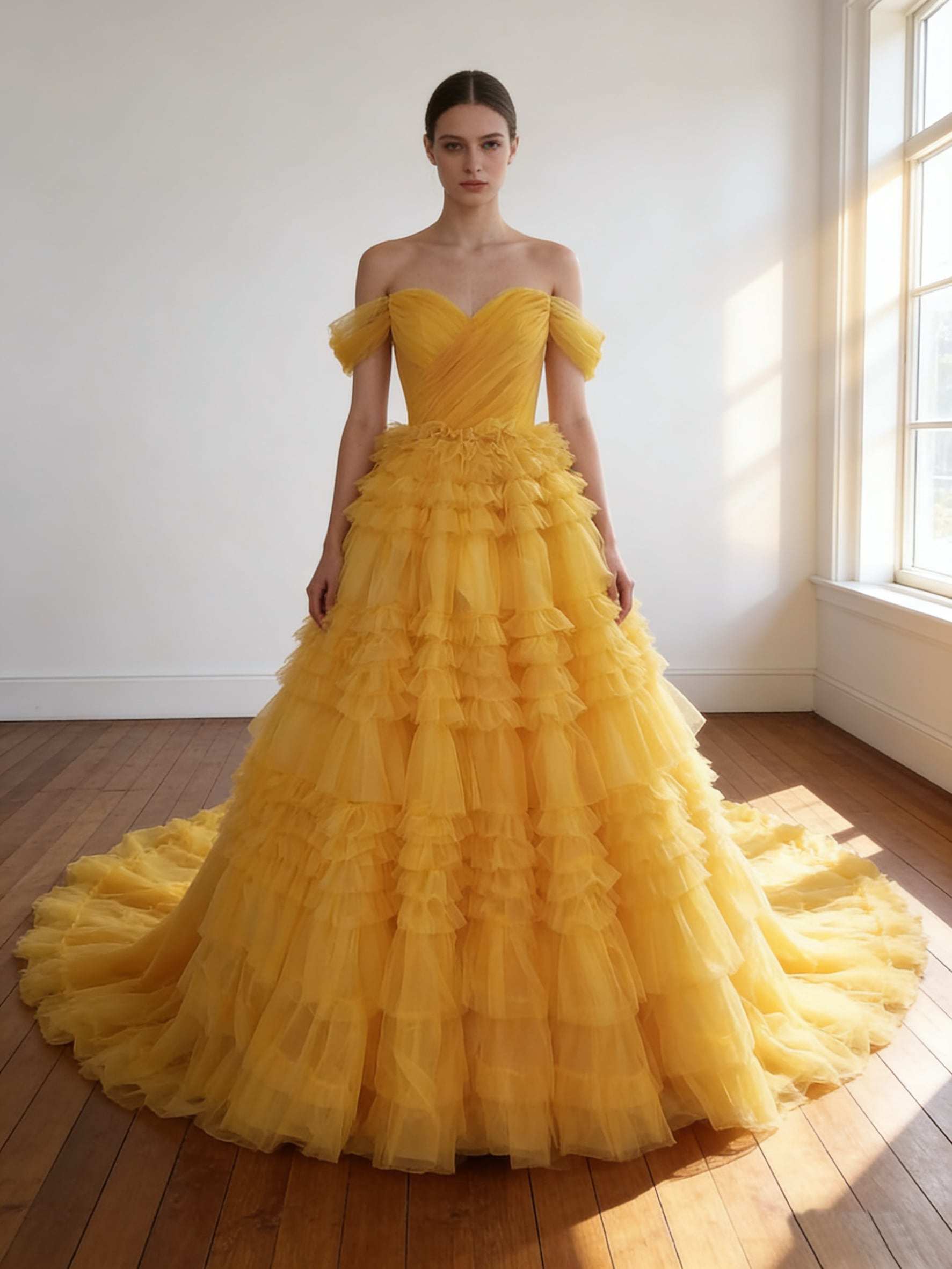 カラードレス 黄色い オフショルダー 編み上げ スリット 華やかなトレーン ソフトチュール 花嫁 前撮り
