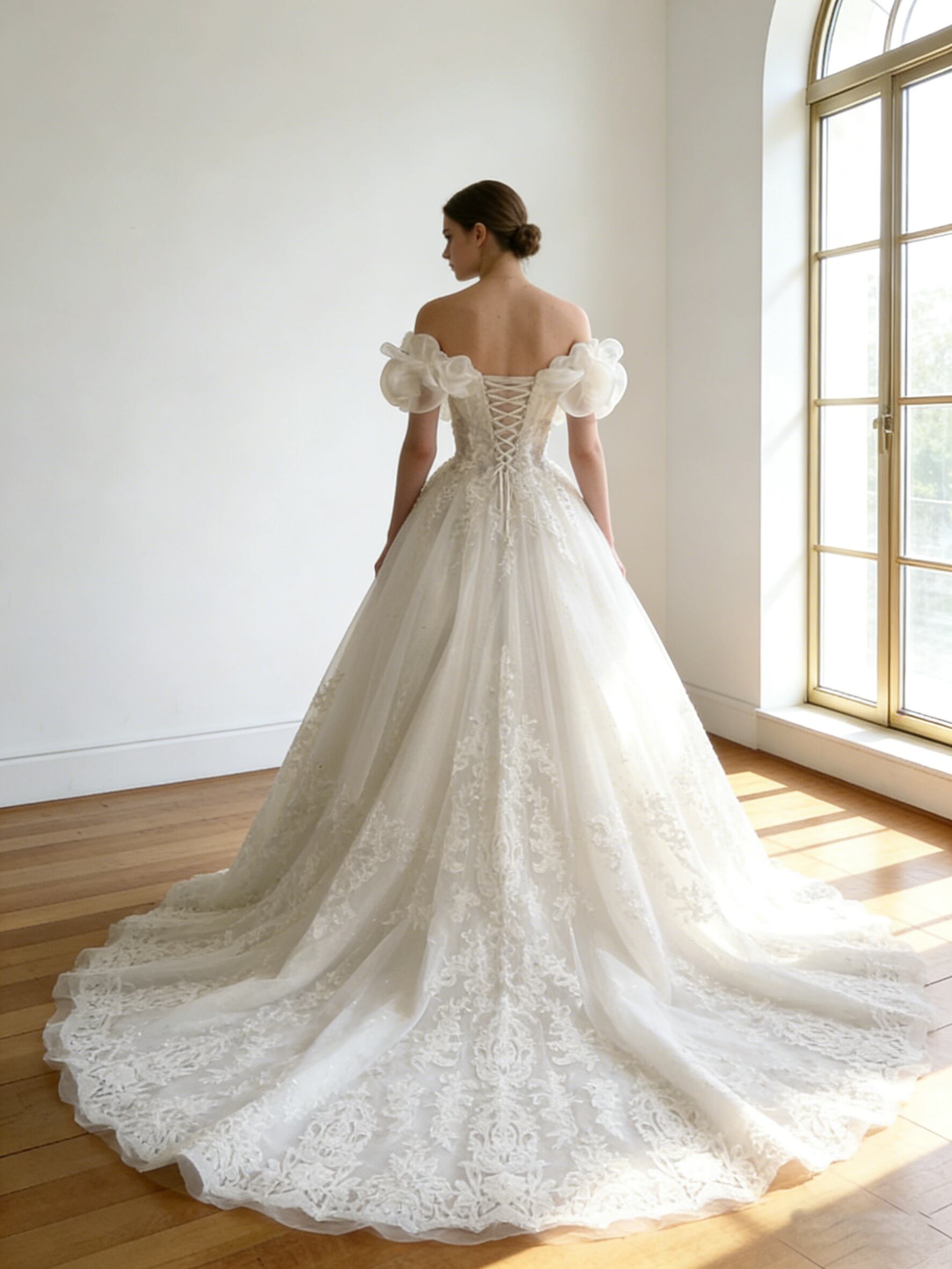ウエディングドレス オフホワイト オフショルダー 贅沢な総レース 編み上げ 華やかなトレーン ブライダル