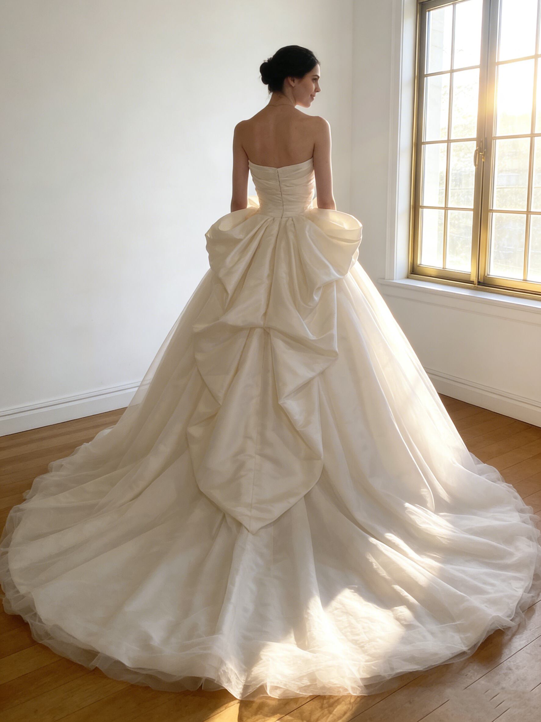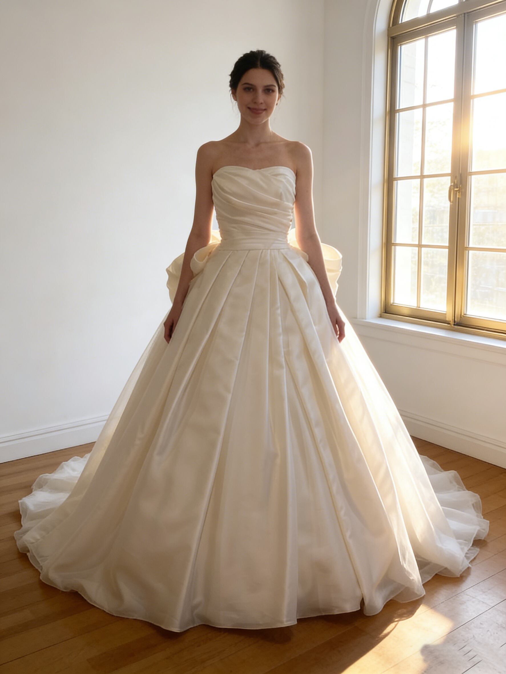 ウエディングドレス オフホワイト ビスチェドレス スリット ふっくら柔らかなバックリボン ブライダル