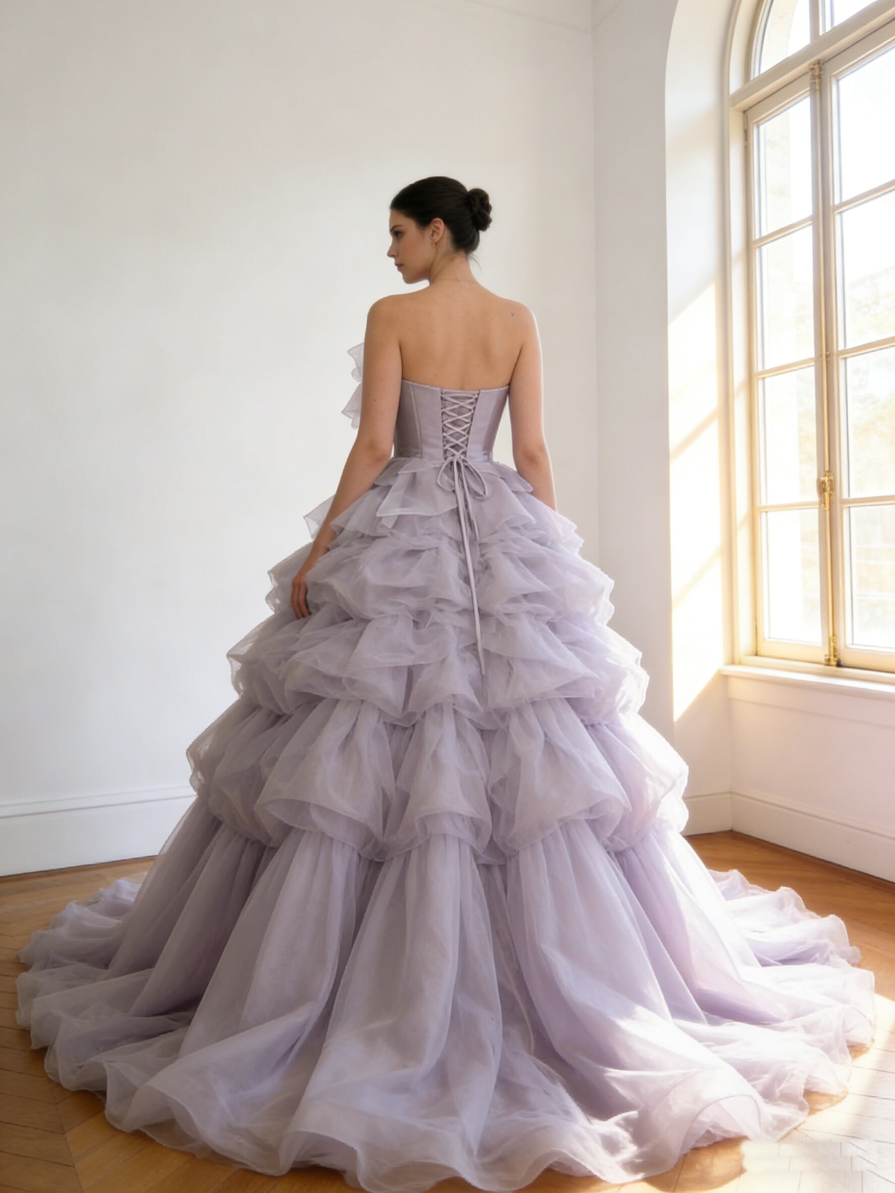 カラードレス オーキッド ビスチェドレス 編み上げ 華やかなトレーン レイヤードドレス 花嫁 のコピー