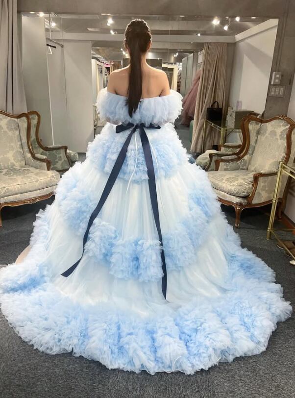 カラードレス 爽やかで優しいブルー オフショルダー サッシュベルト ボリュームドレス ロングトレーン 花嫁