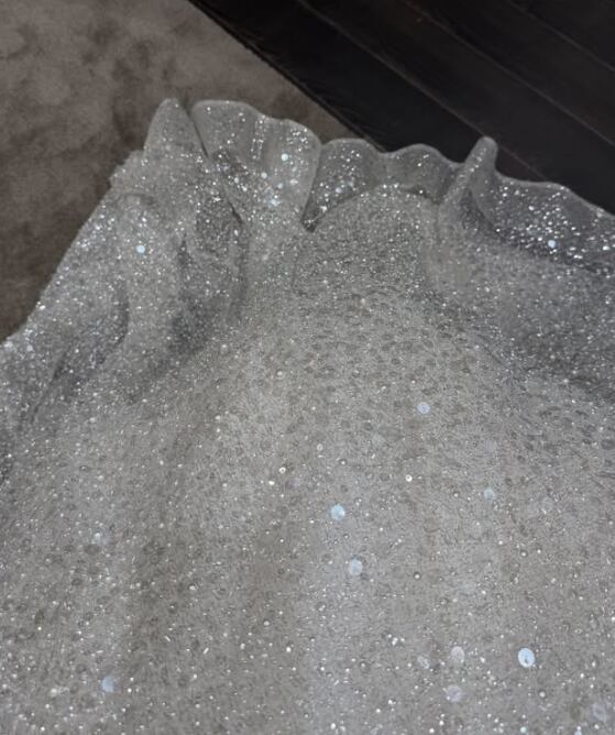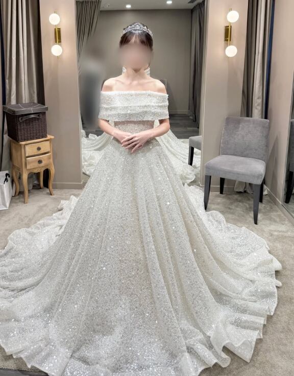 ウエディングドレス オフホワイト オフショルダー インポートビジューレース 華やかなトレーン ブライダル