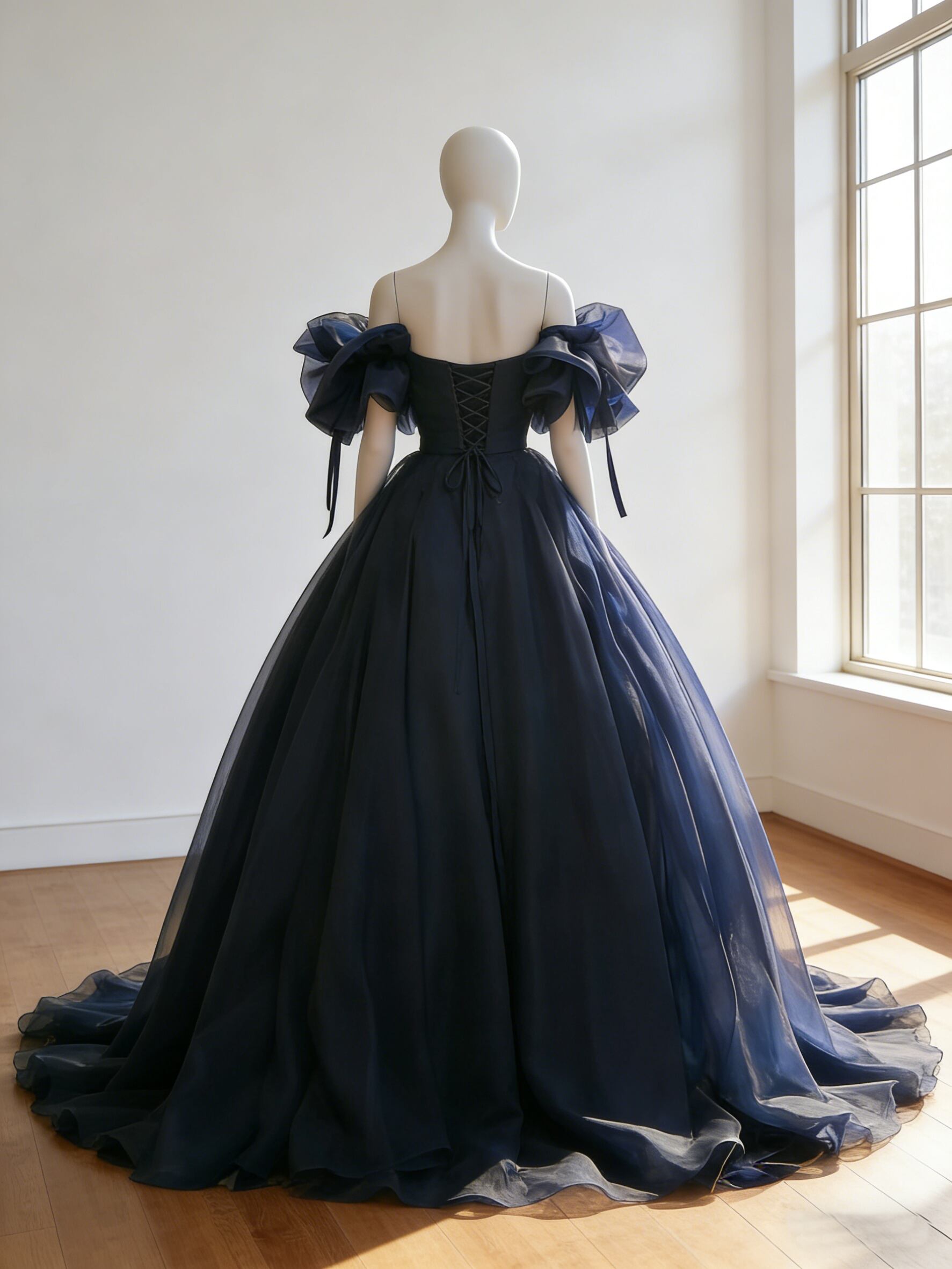 カラードレス ネイビー 取り外し可能な付け袖 上質オーガンジー 編み上げ 短トレーン 花嫁 前撮り