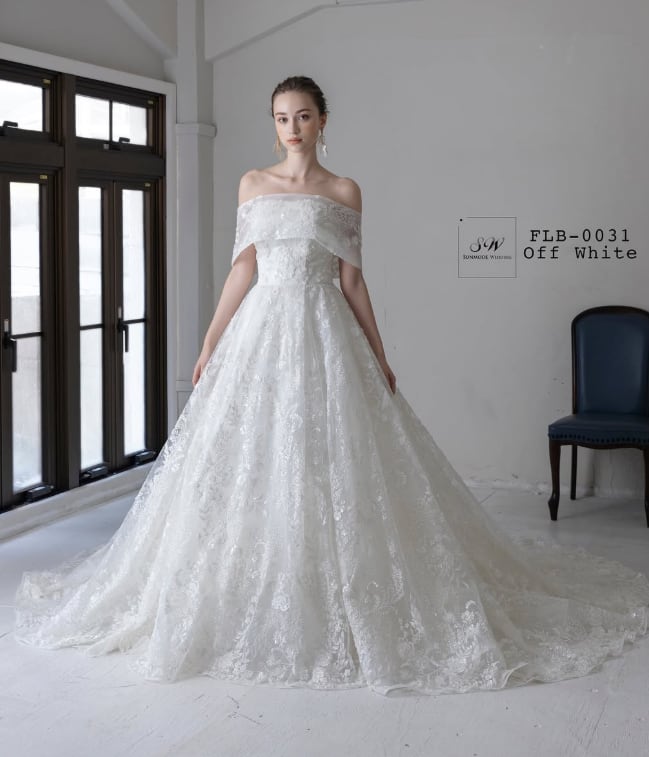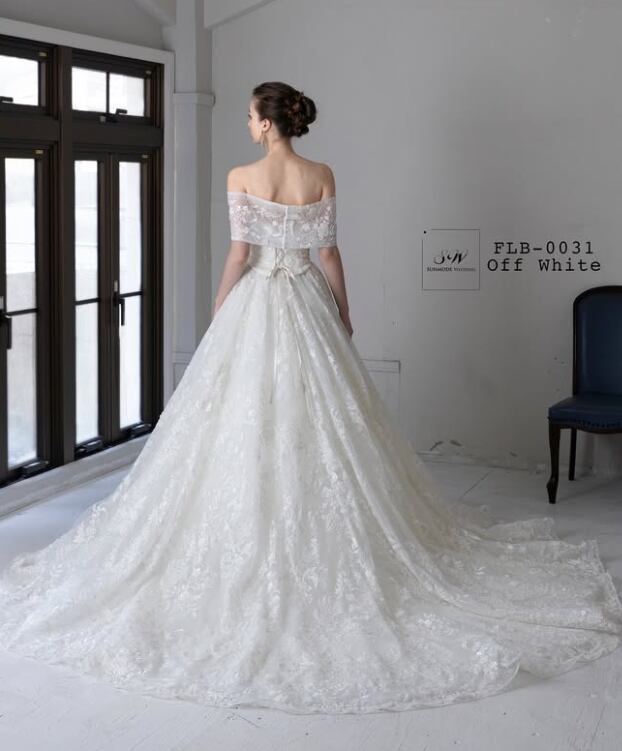 ウエディングドレス オフホワイト 取り外し可能なオフショルダー 贅沢な総レース 華やかなトレーン ブライダル