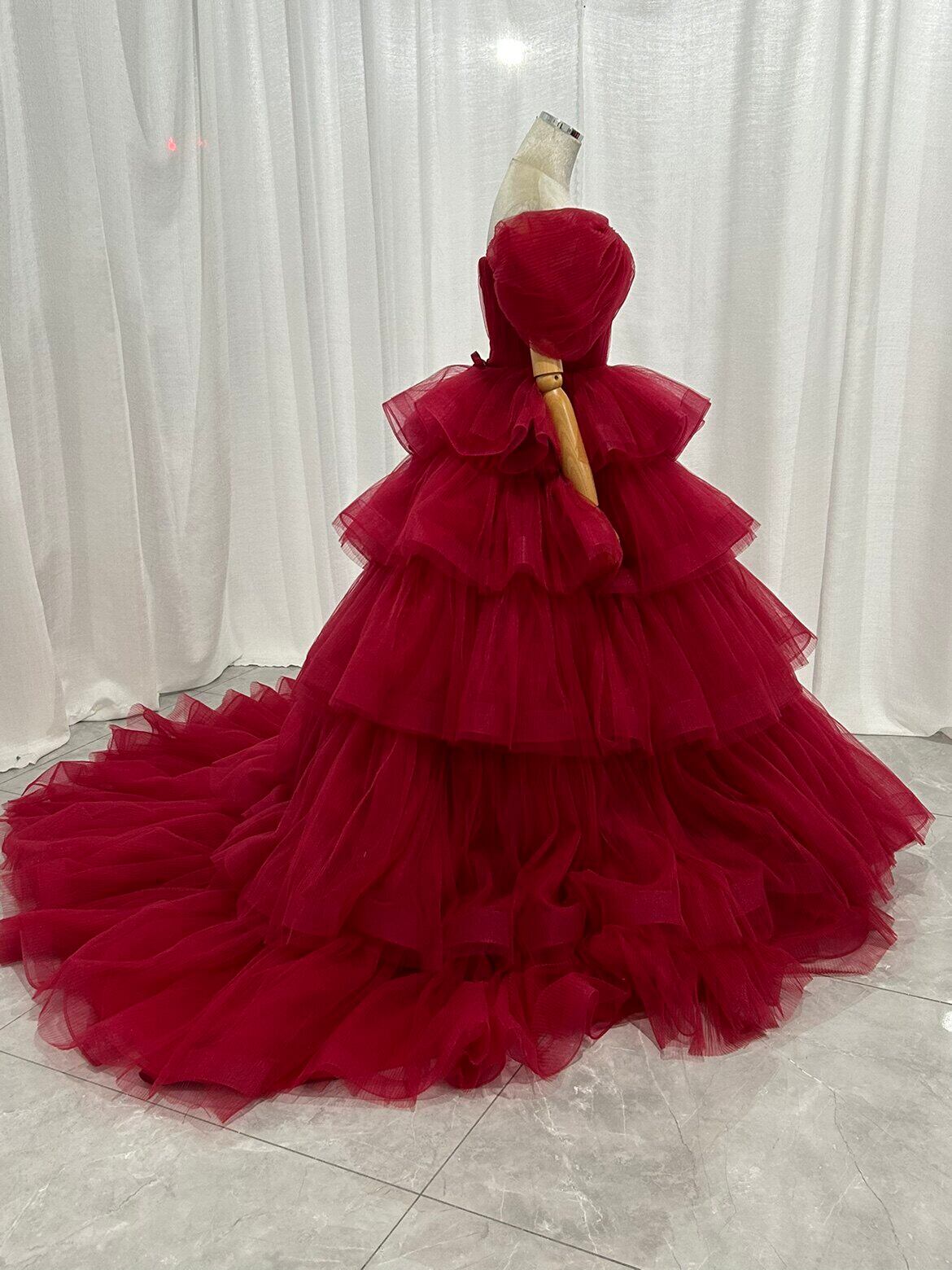 カラードレス ボルドー色 オフショルダー 編み上げ ロングトレーン ソフトチュール 花嫁 前撮り