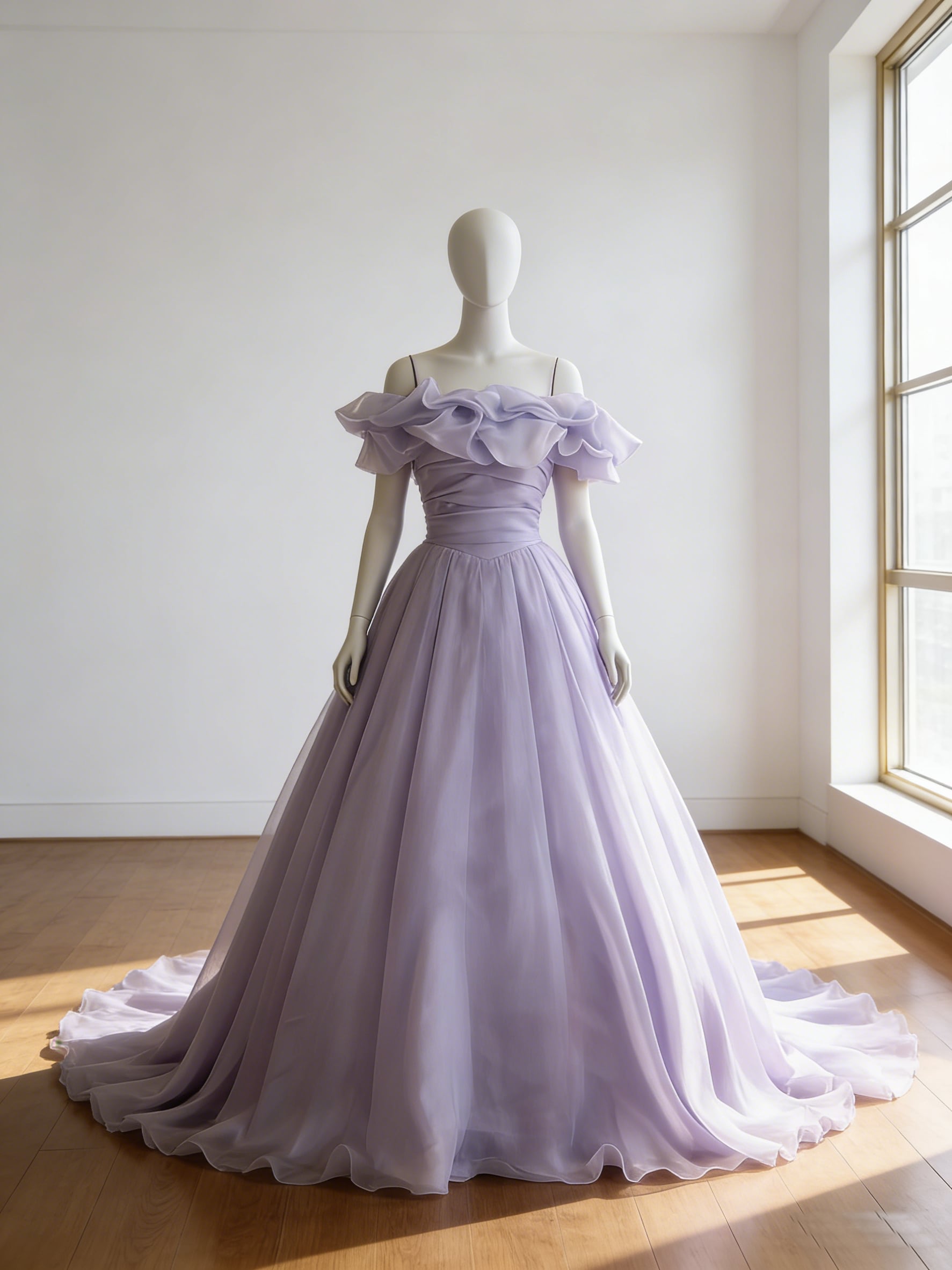 カラードレス パープル 上質オーガンジー オフショルダー ロングトレーン 編み上げ 花嫁 前撮り