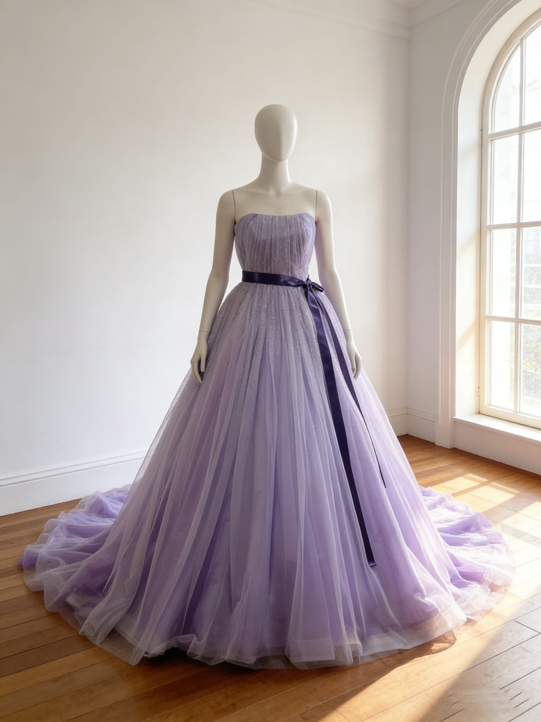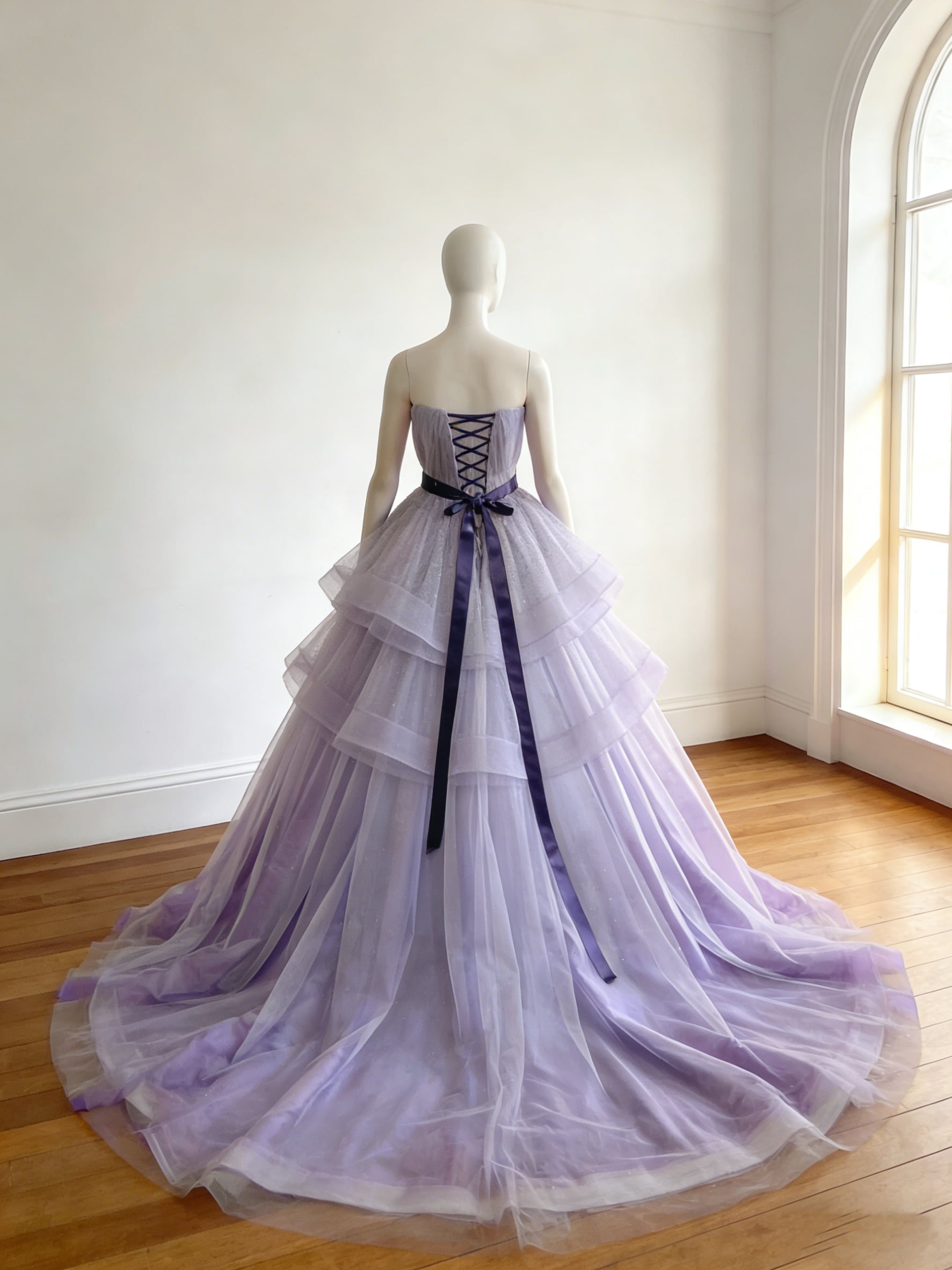 カラードレス パープル ビスチェドレス サッシュベルト チュールドレス 編み上げ 華やかなトレーン 花嫁 前撮り