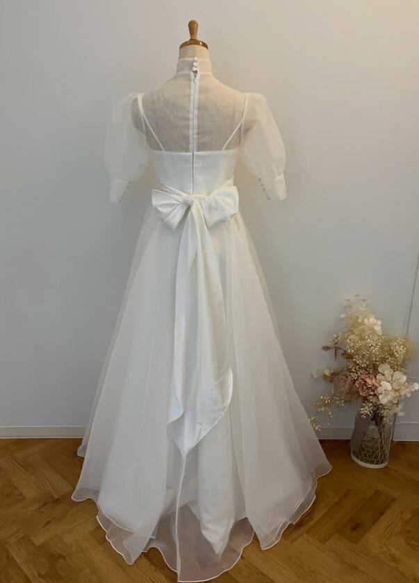 ウエディングドレス 七分袖丈 オフホワイト くるみボタン ふっくら柔らかなバックリボン ロング 花嫁 前撮り