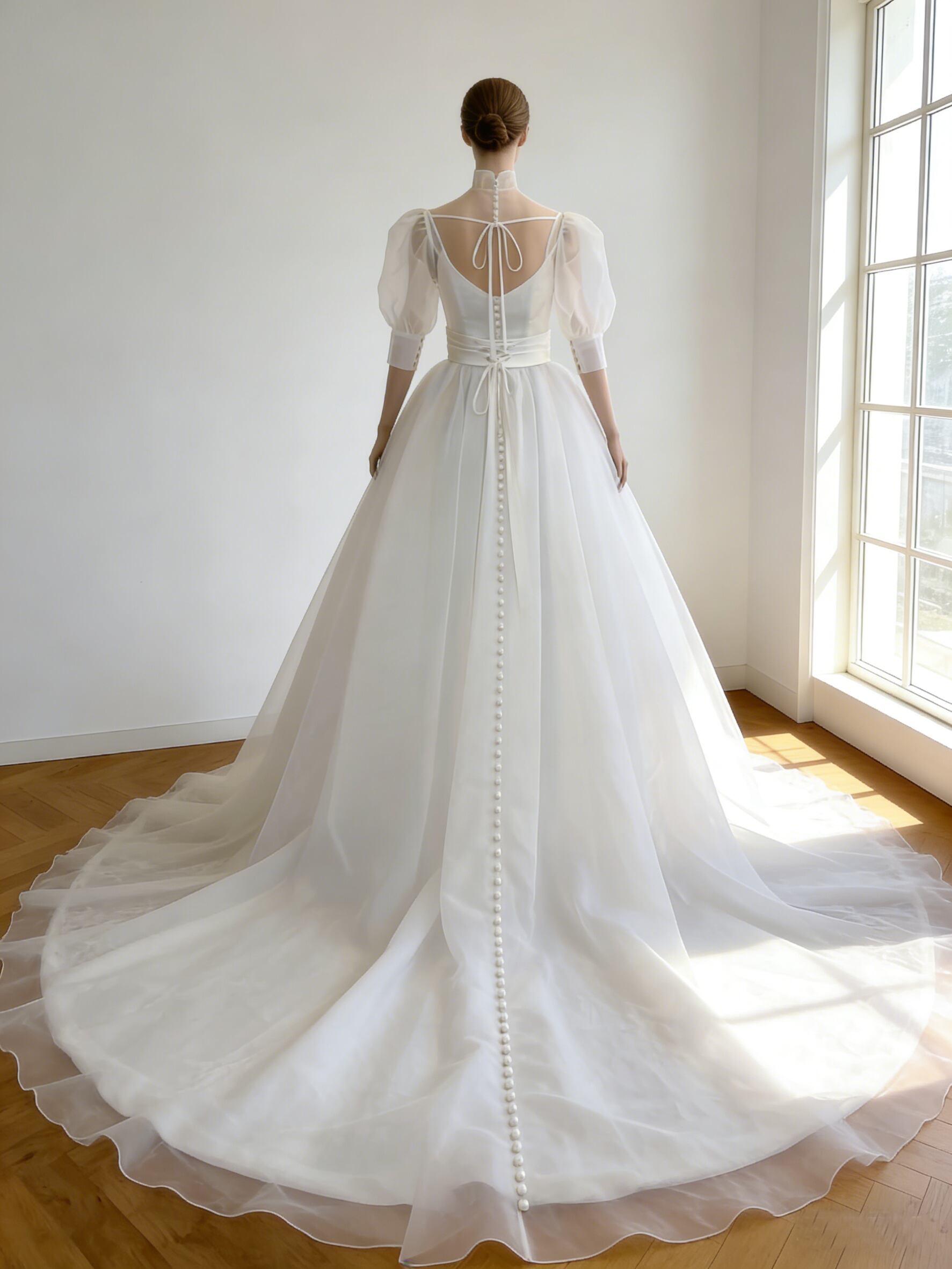 ウエディングドレス オフホワイトくるみボタン 七分袖丈 華やかなトレーン ラウンドネック ブライダル