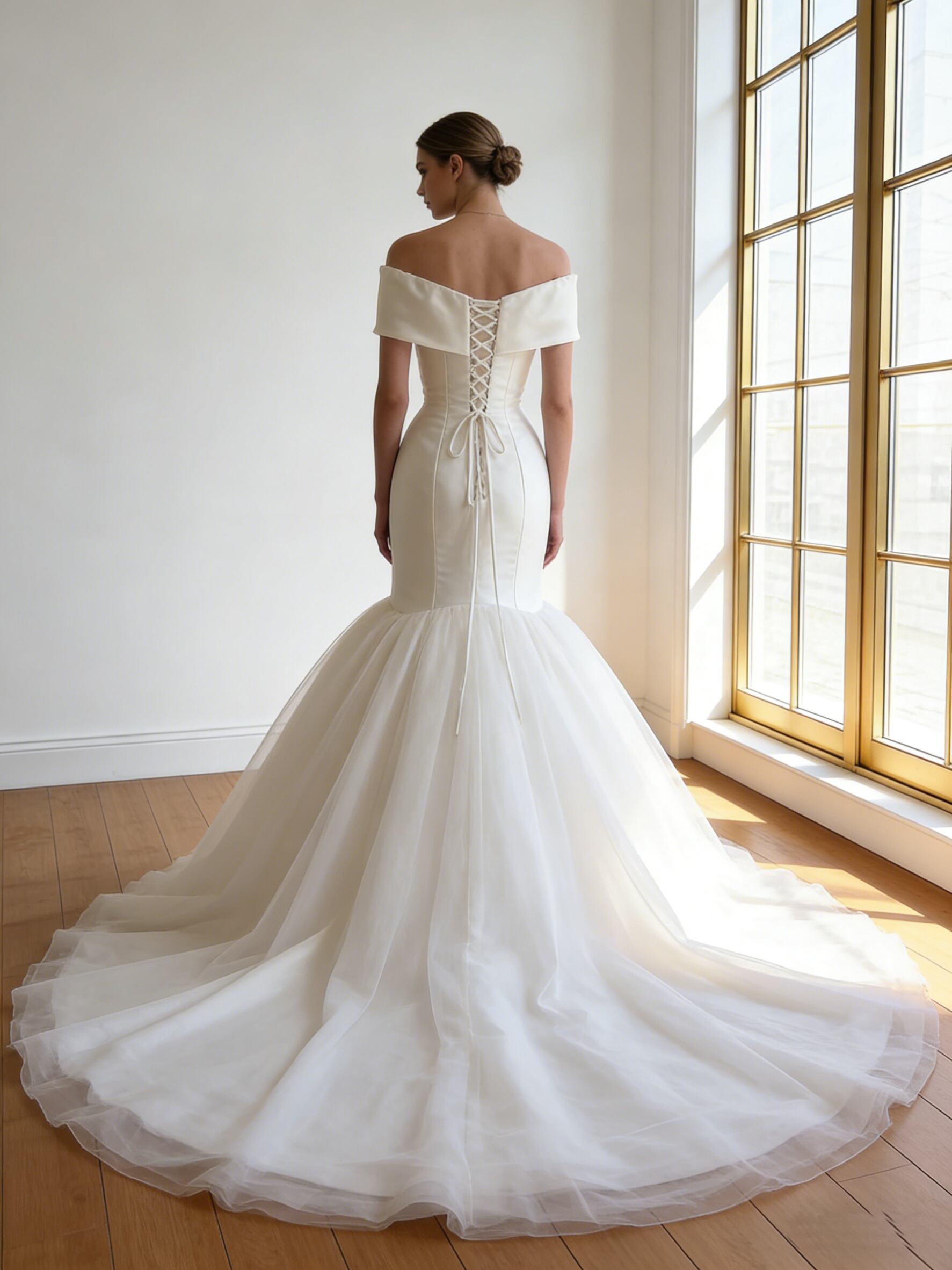 ウエディングドレス オフホワイト オフショルダー 編み上げ ソフトマーメイドライン 華やかなトレーン ブライダル