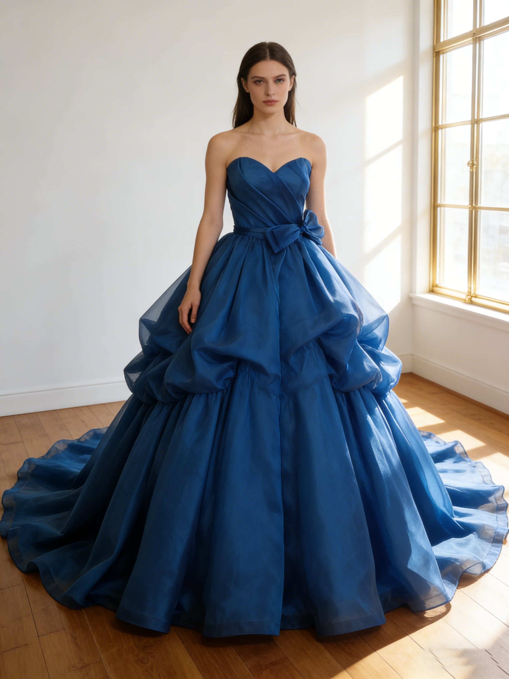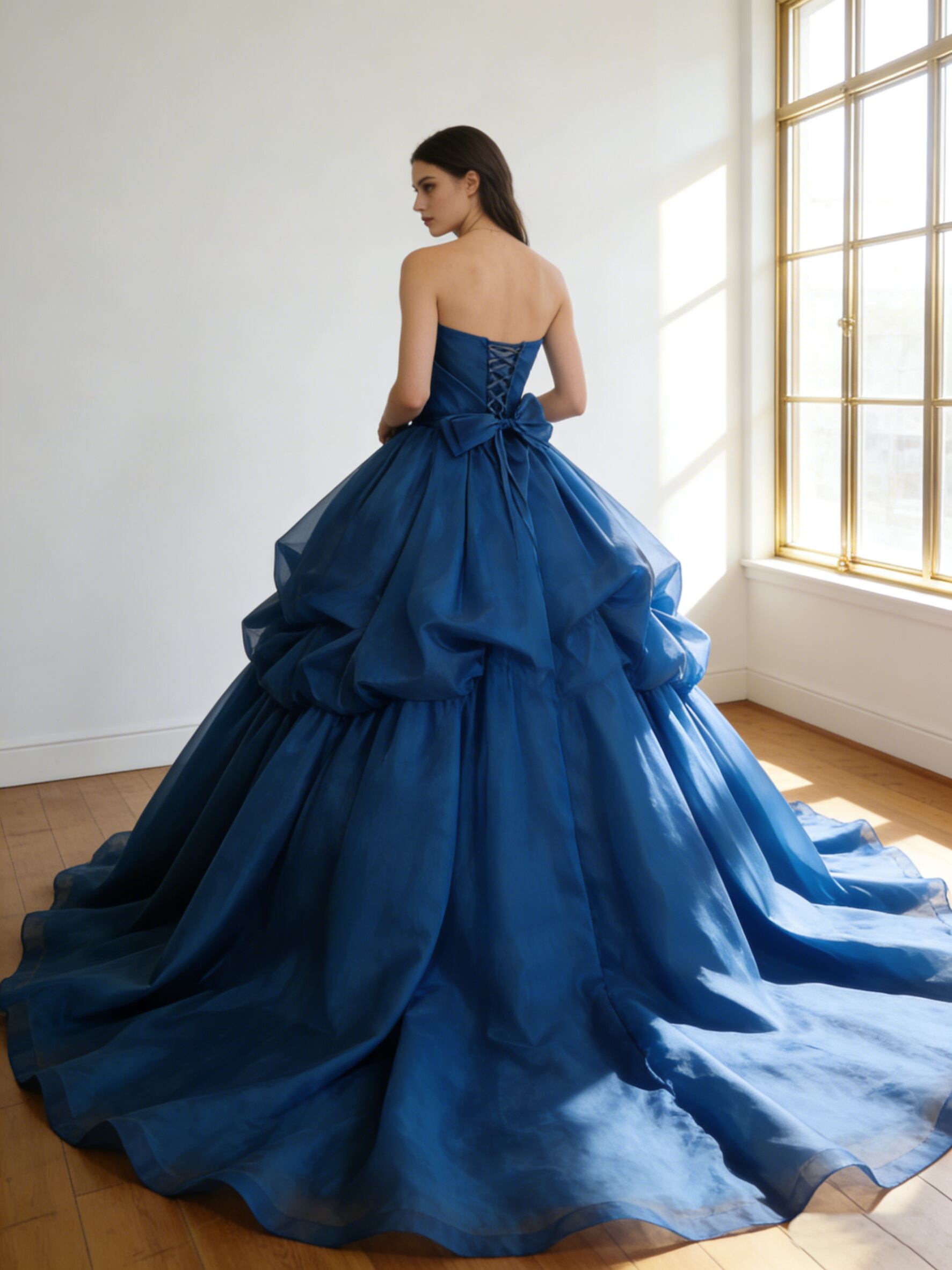 カラードレス ジュエルネイビー リボン ビスチェドレス 華やかなトレーン 演奏会/音楽会 花嫁 前撮り