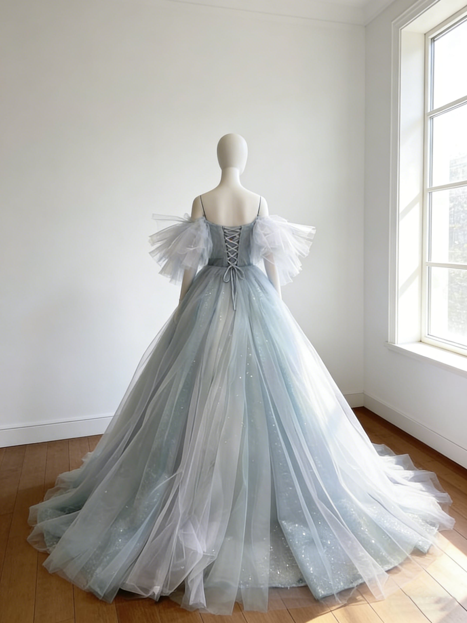 カラードレス 薄青 オフショルダー グラデーションドレス シークインチュール 華やかなトレーン 編み上げ 花嫁 前撮り