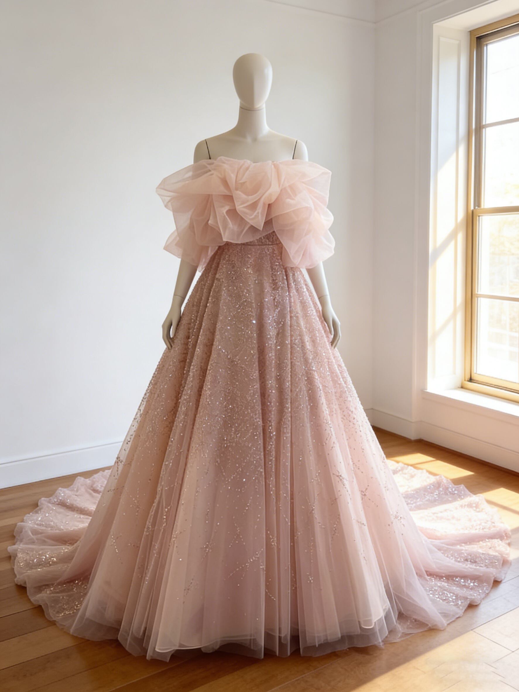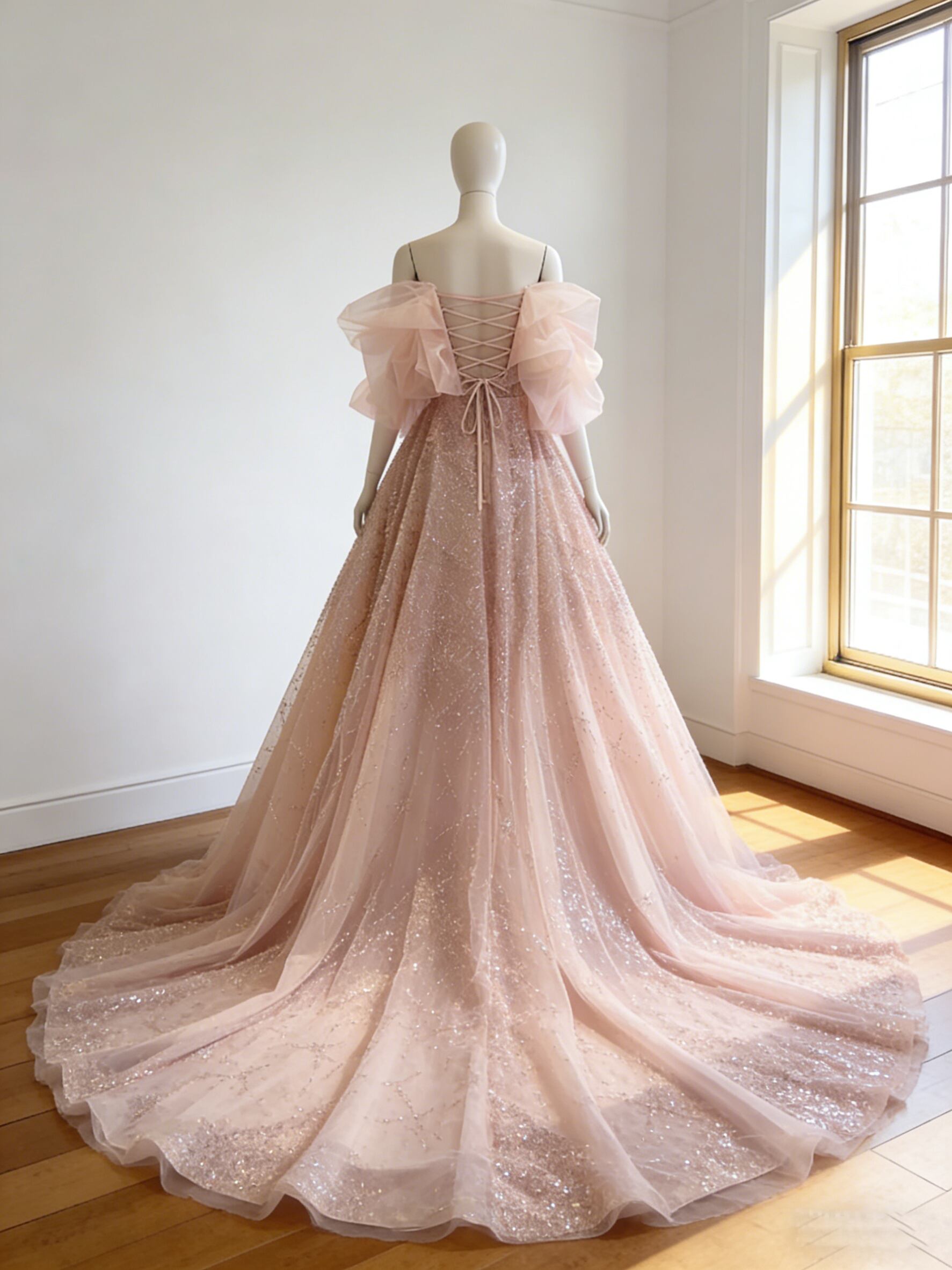 カラードレス ピンク オフショルダー シークインチュール 華やかなトレーン 編み上げ 花嫁 前撮り