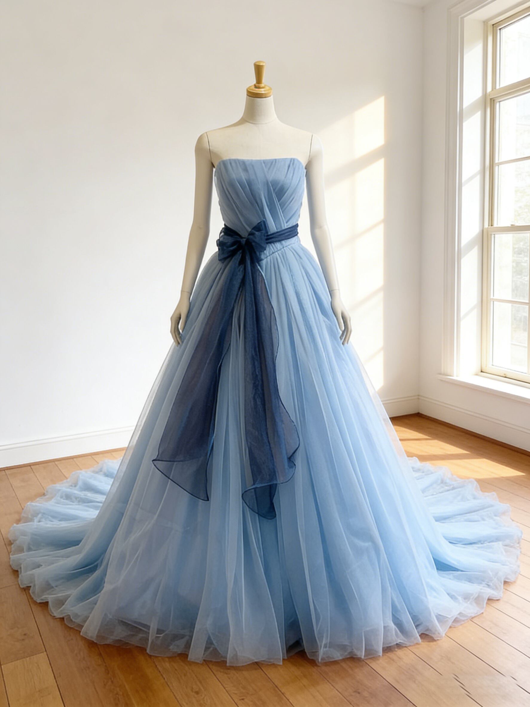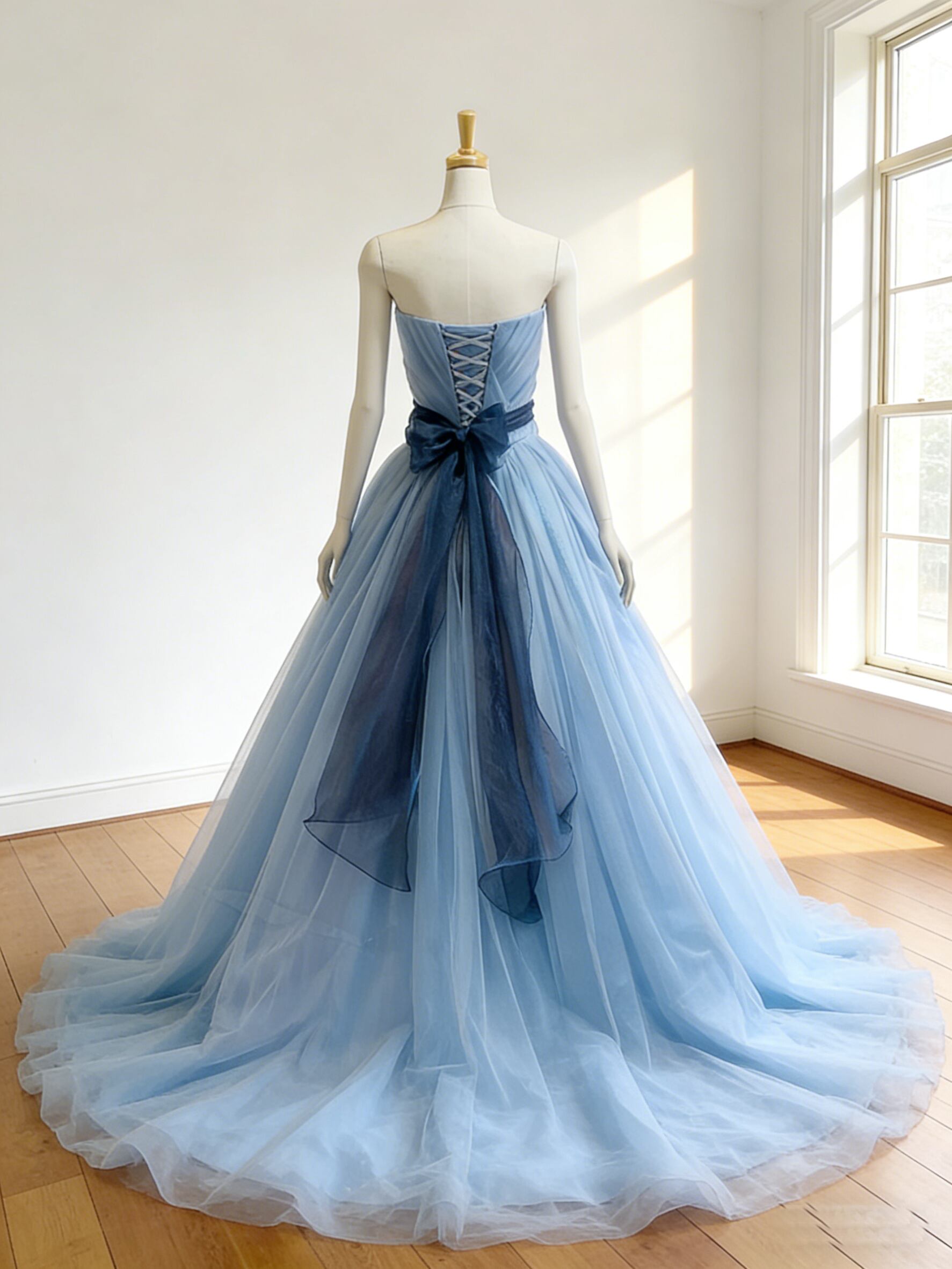 カラードレス 爽やかで優しいブルー ビスチェドレス ふっくら柔らかなバックリボン チュールドレス 花嫁 前撮り