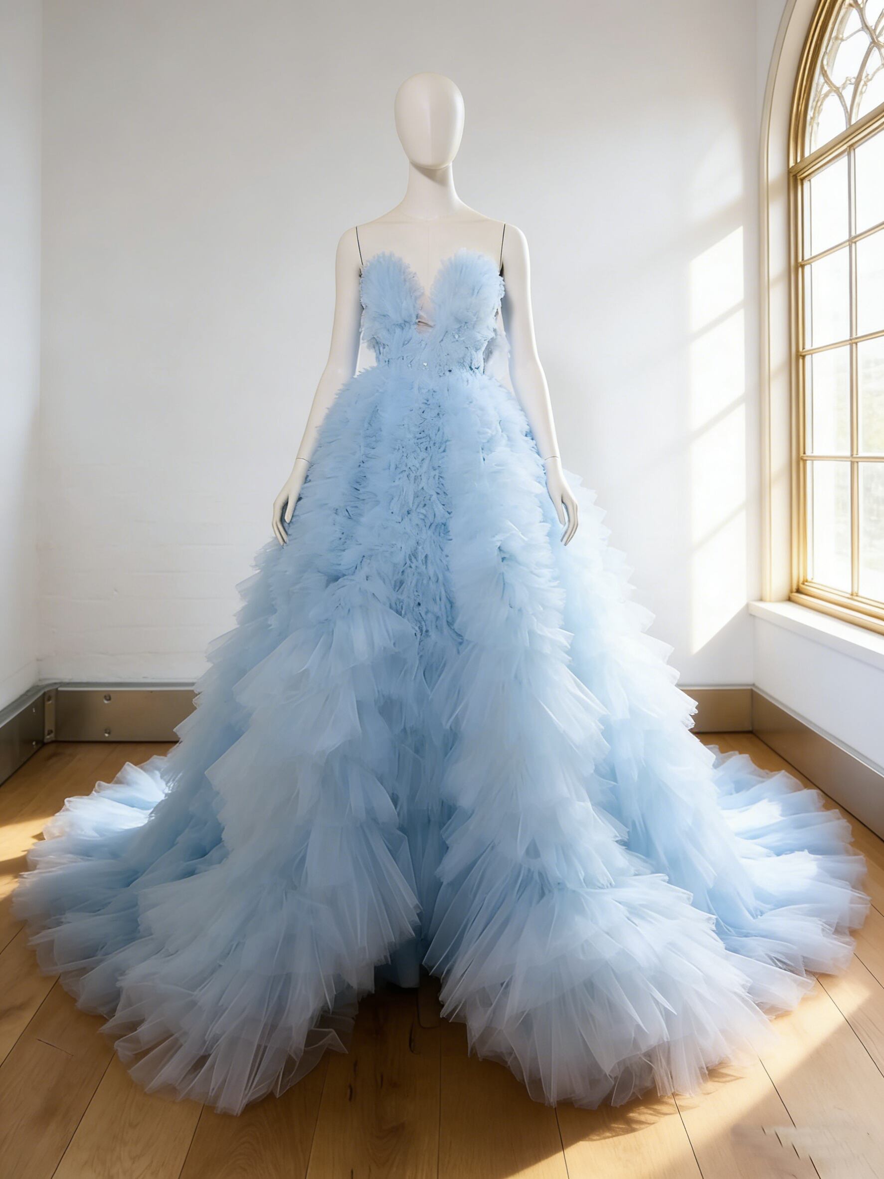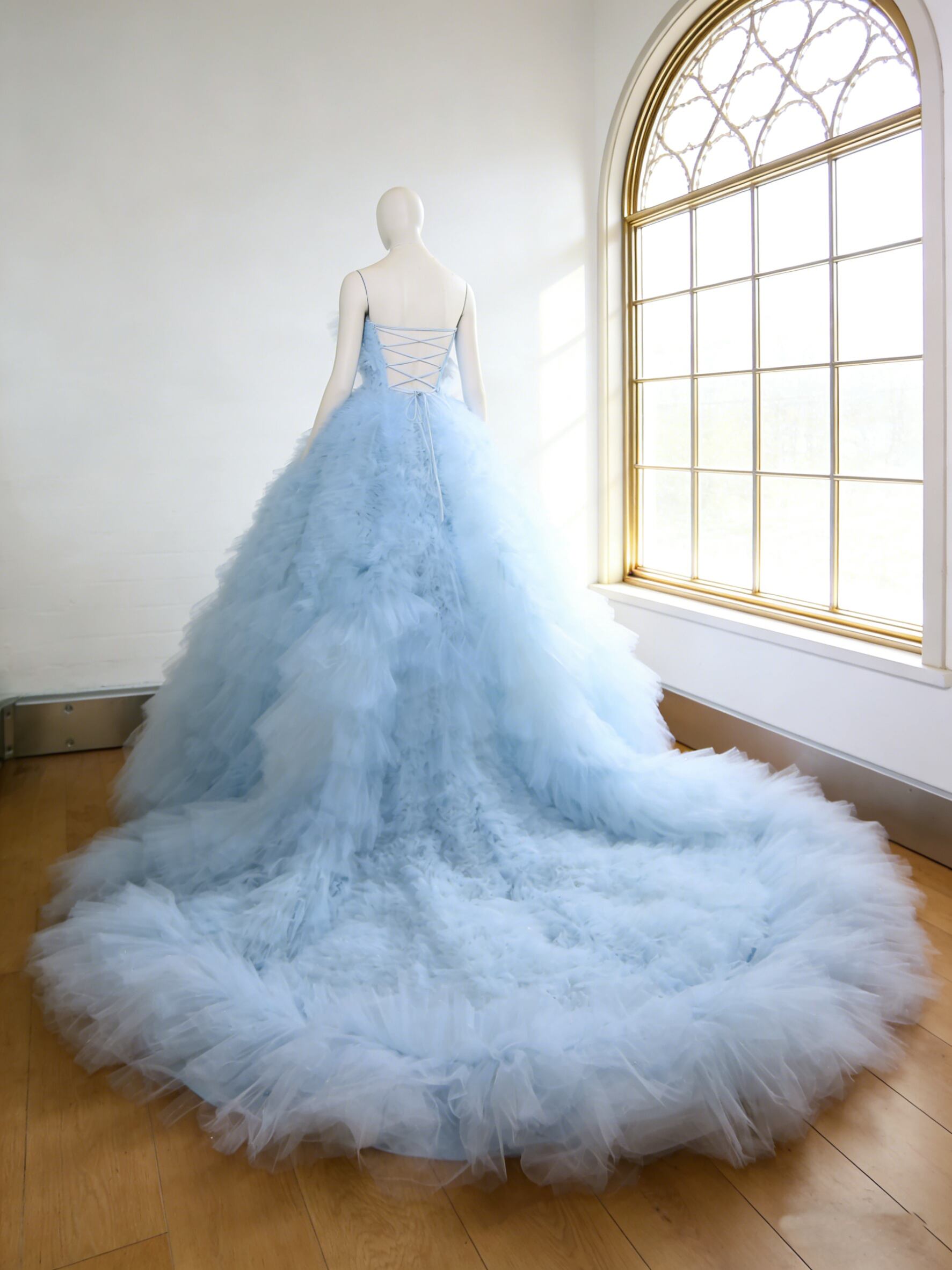 カラードレス 爽やかで優しいブルー もこもこドレス 編み上げ 華やかなトレーン ビスチェドレス 花嫁 前撮り