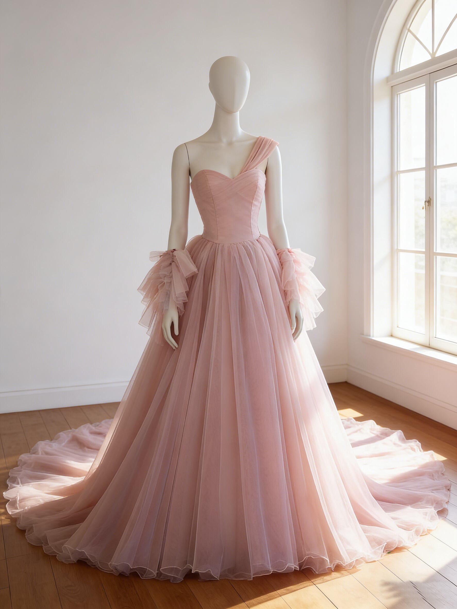 カラードレス ピンク 取り外し可能な付け袖 ショルダー型 華やかなトレーン ソフトチュール 結婚式 前撮り