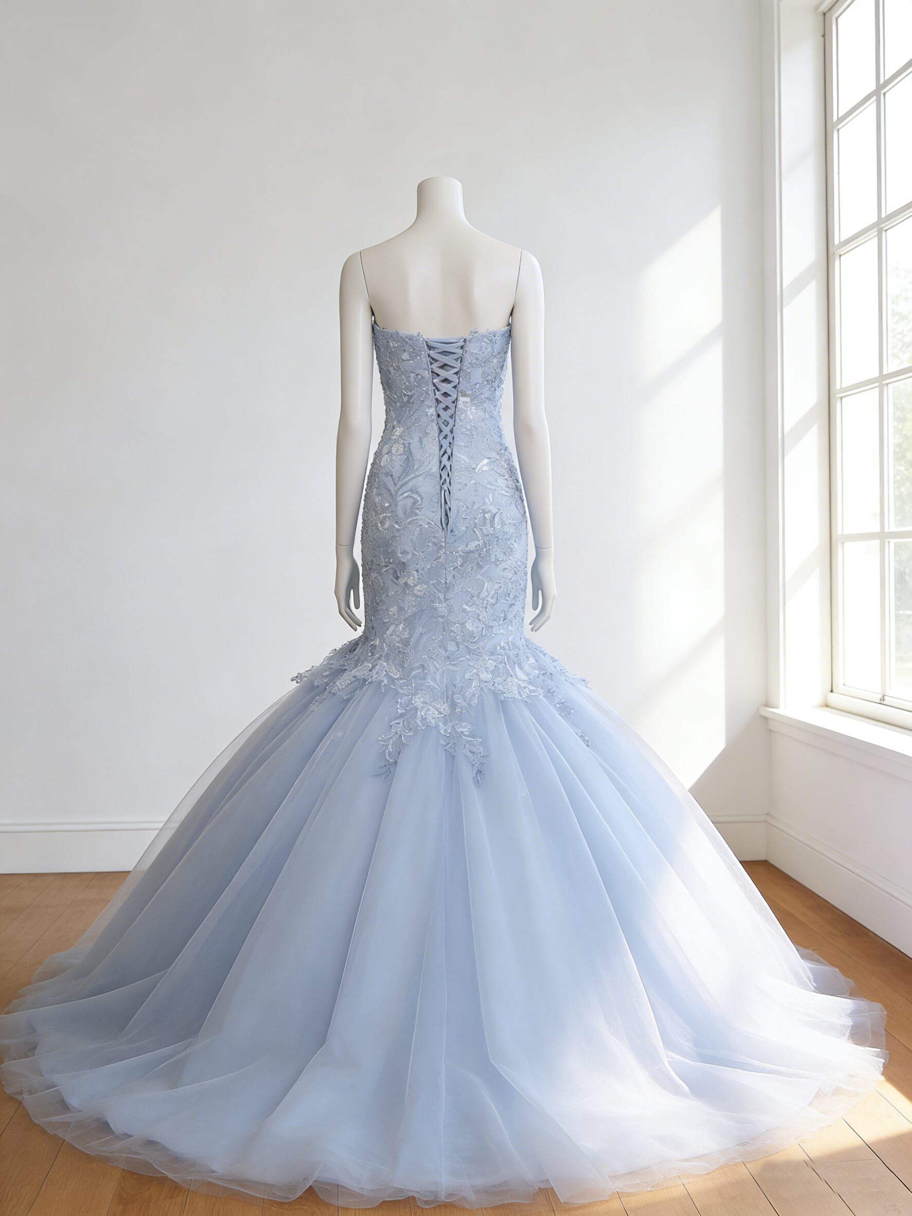 カラードレス 爽やかで優しいブルー ビスチェドレス 繊細なレース 編み上げ ソフトマーメイドライン華やかなトレーン 結婚式