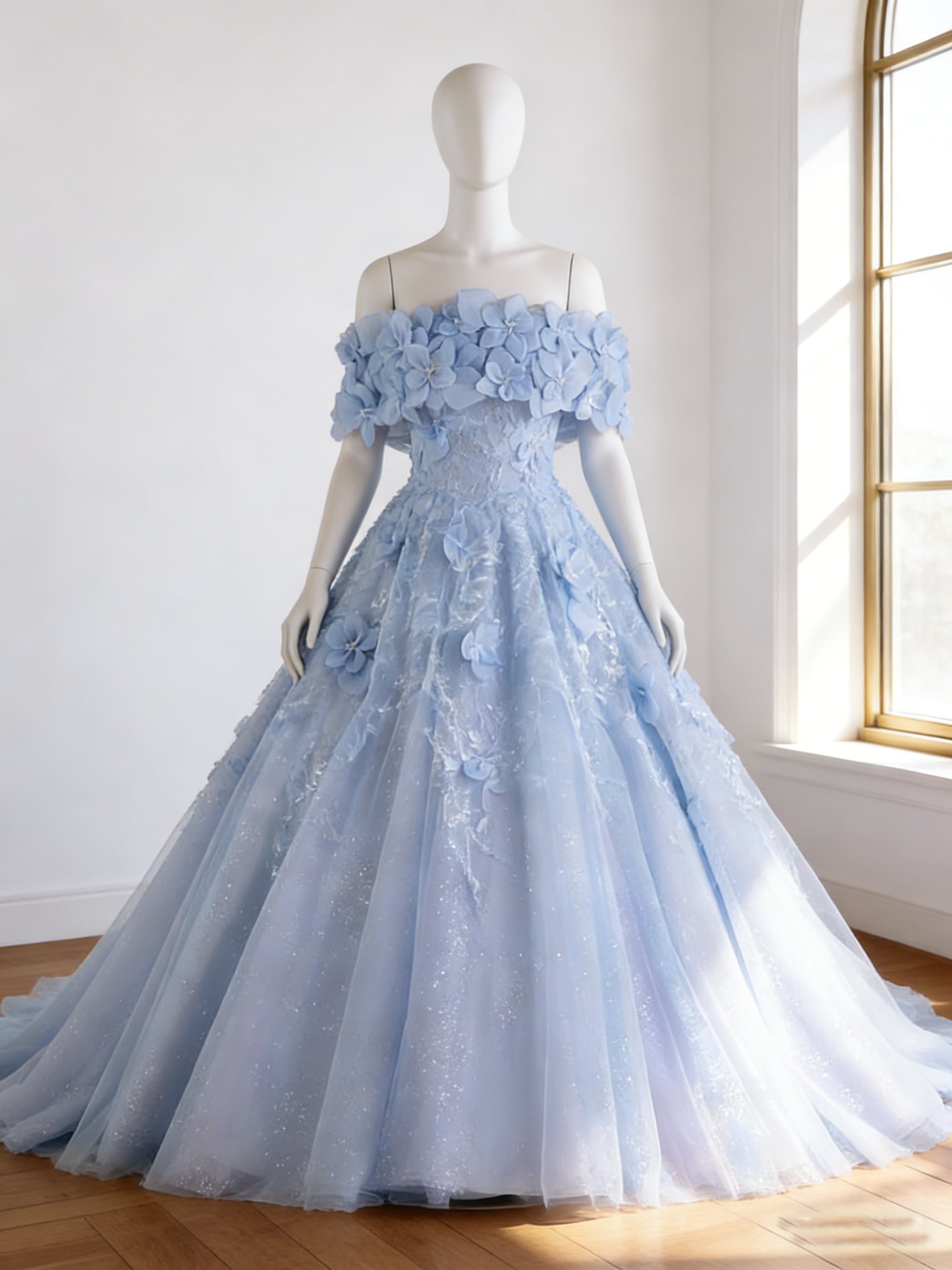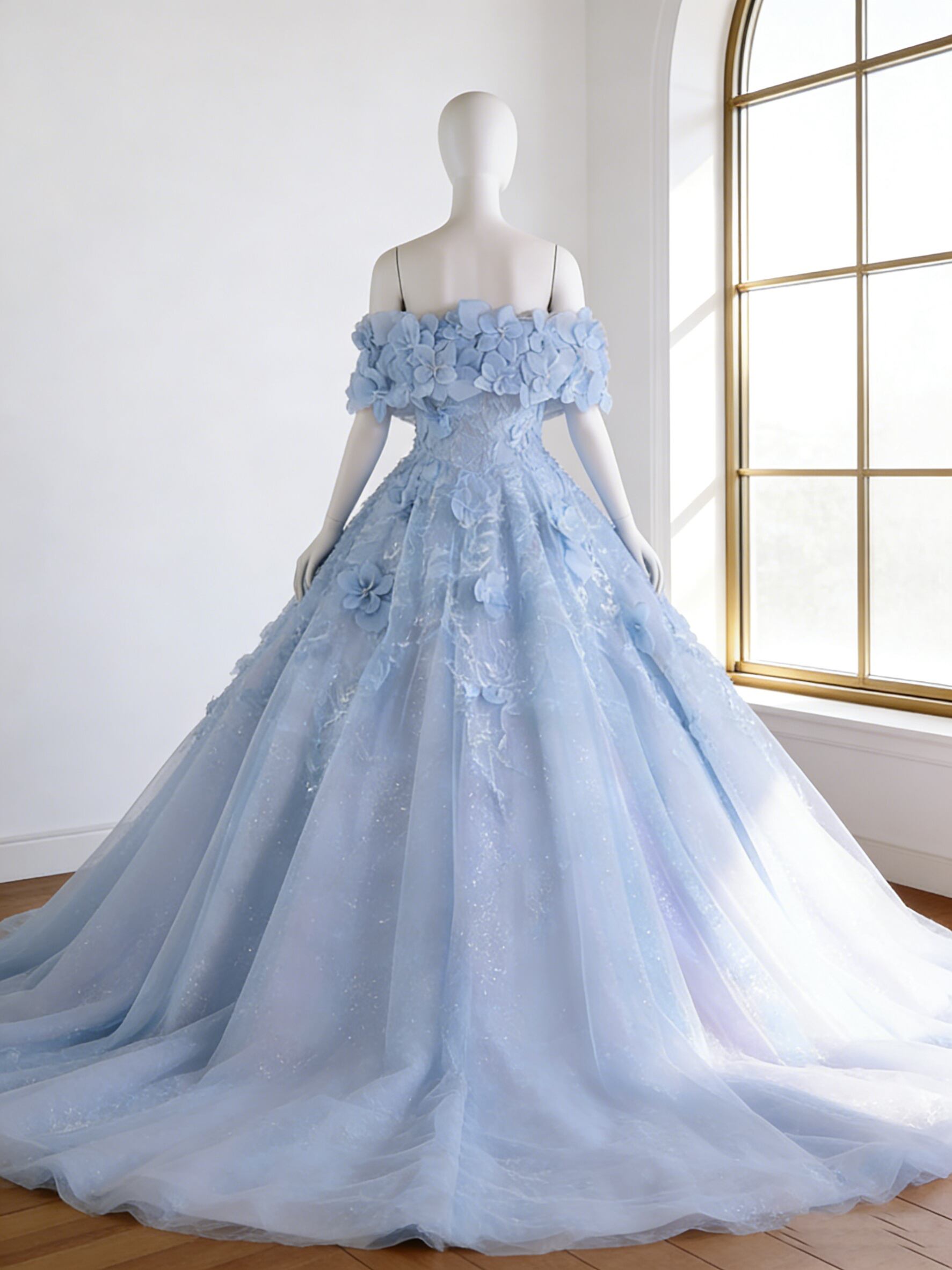 カラードレス 爽やかで優しいブルー フリルオフショルダー シークインチュール 華やかなトレーン 花嫁 前撮り