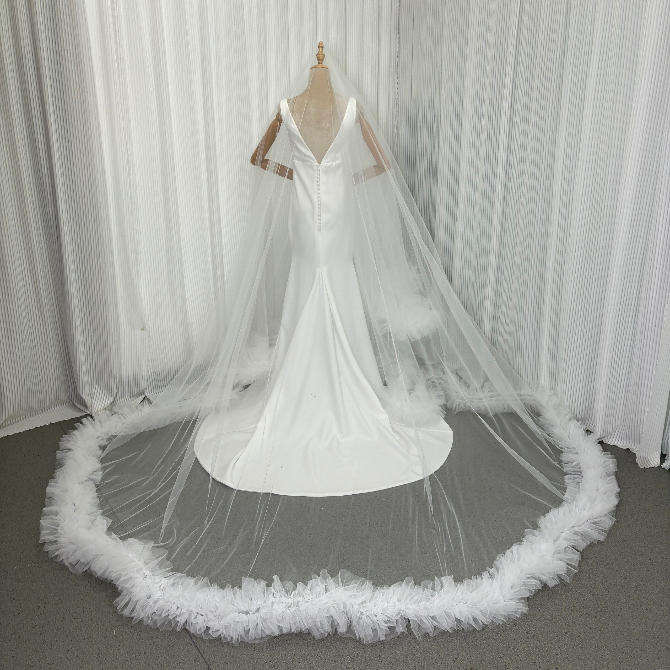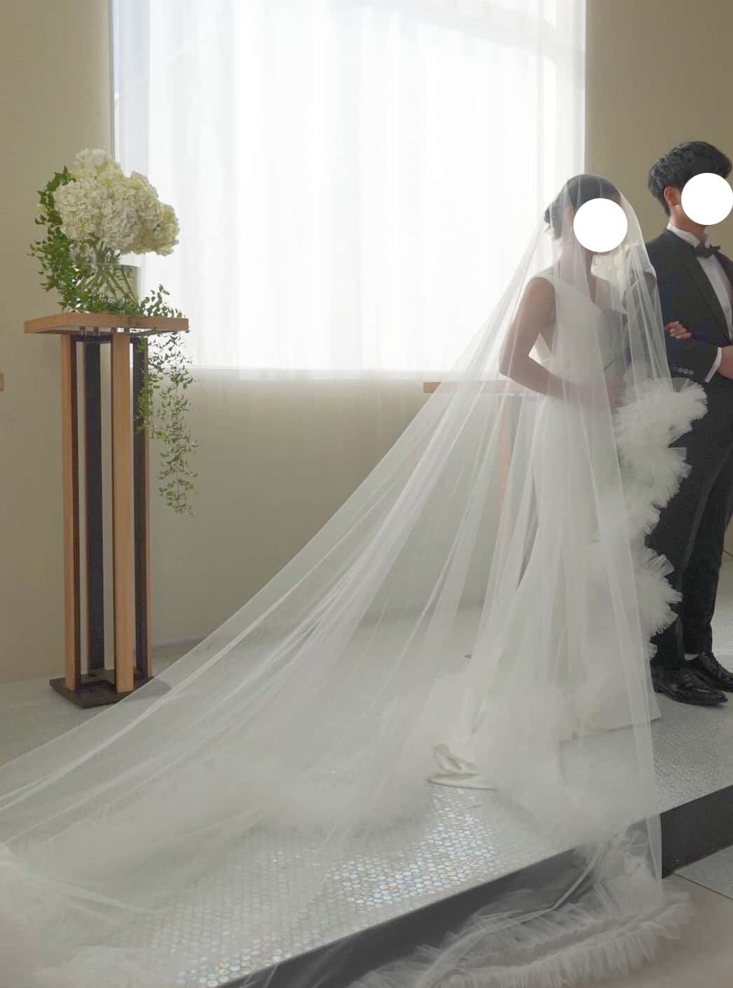 実例写真! ウエディングドレス オフホワイト ロングベール Vネックドレス 高級イタリアサテン ソフトマーメイドライン 華やかなトレーン ブライダル
