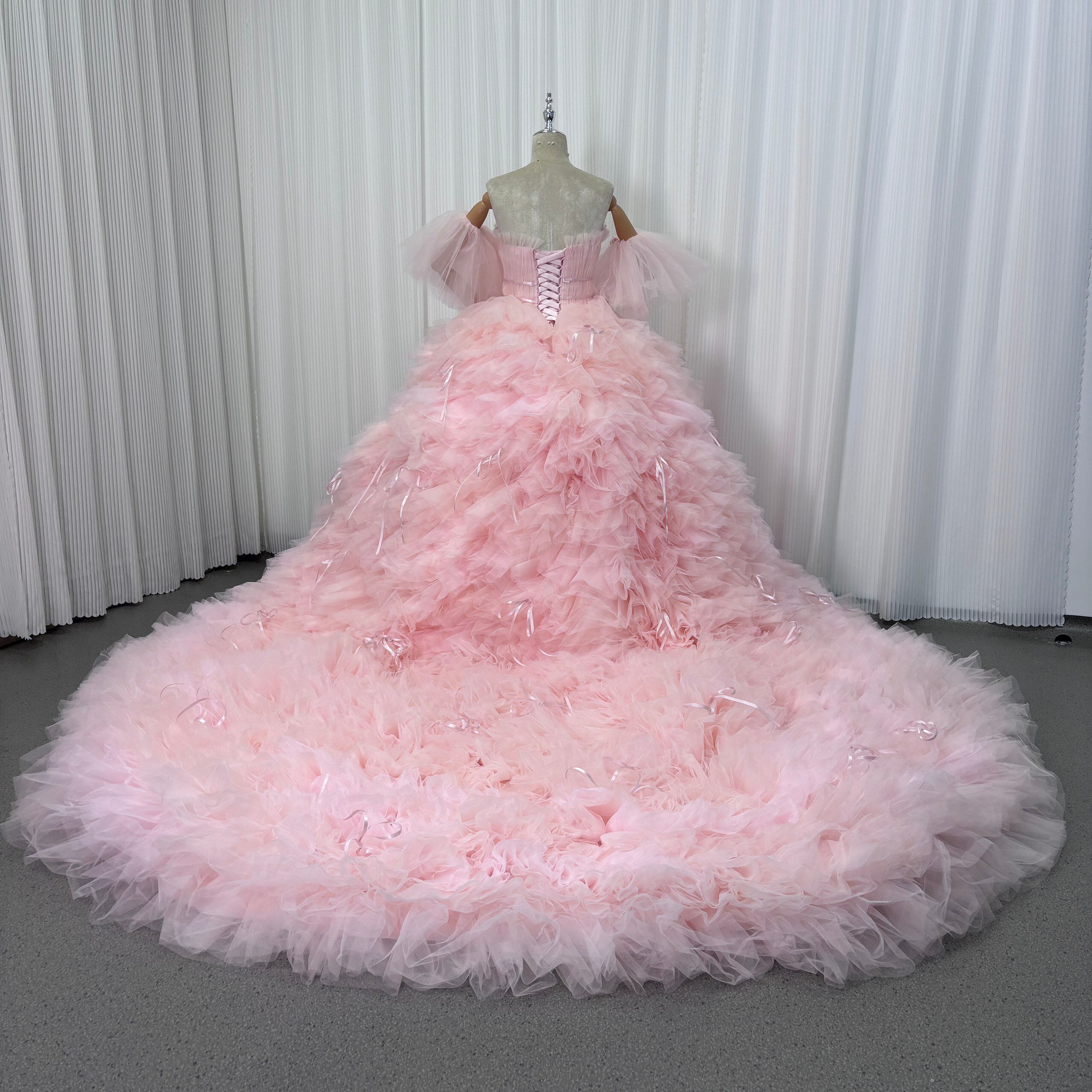 カラードレス ピンク 3色 リボン 取り外し可能な付け袖 もこもこドレス 可愛い 華やかなトレーン 柔らかく重ねたチュールスカート ブライダル