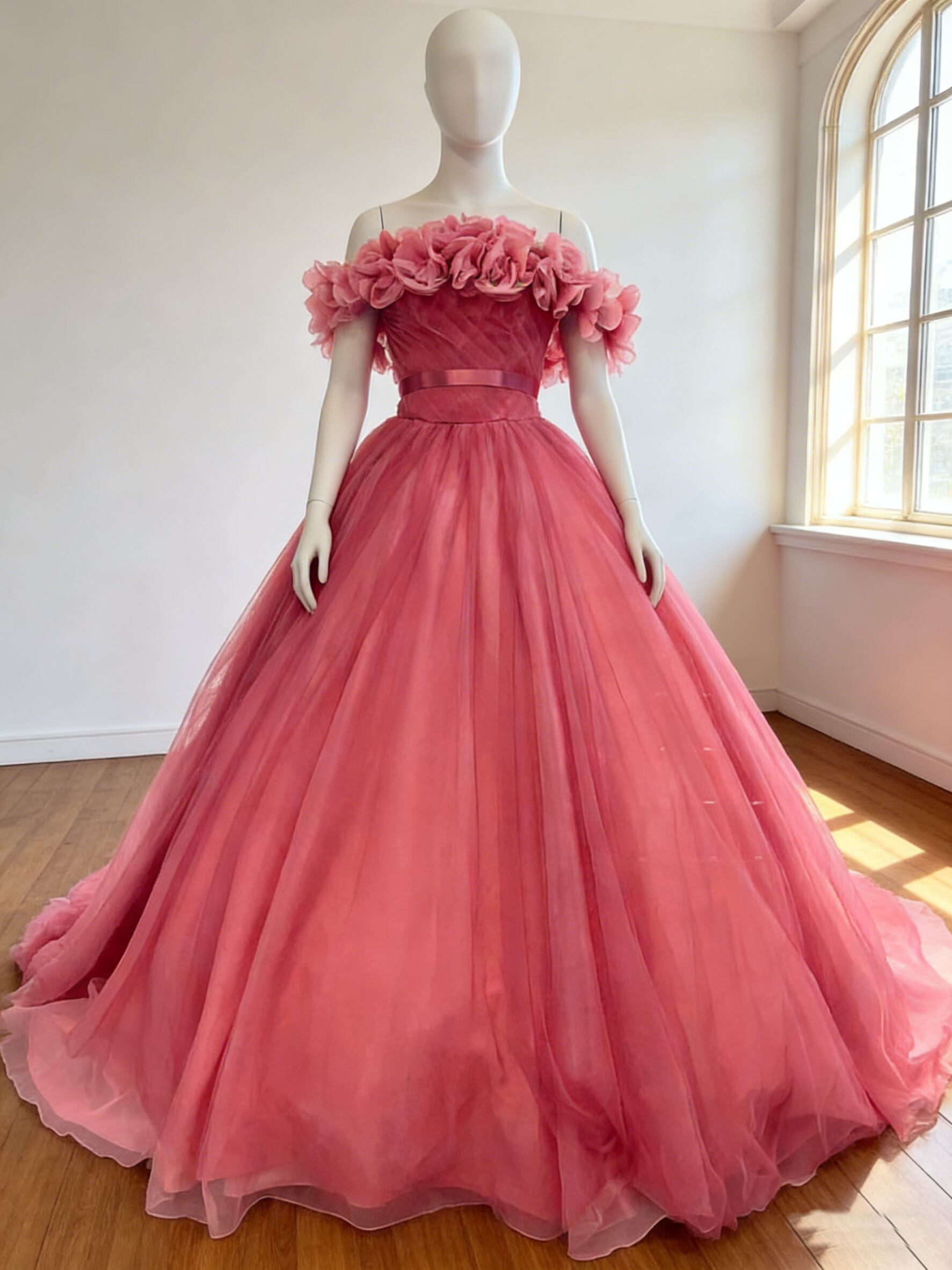 カラードレス ピンク フリルオフショルダー 編み上げ 華やかなトレーン ソフトチュール 花嫁 前撮り