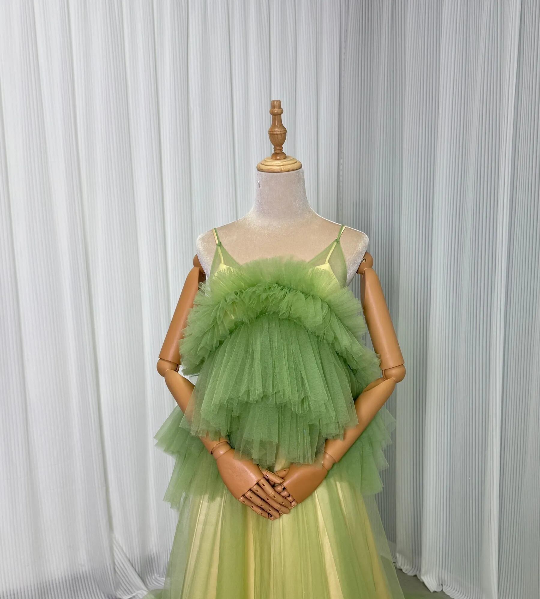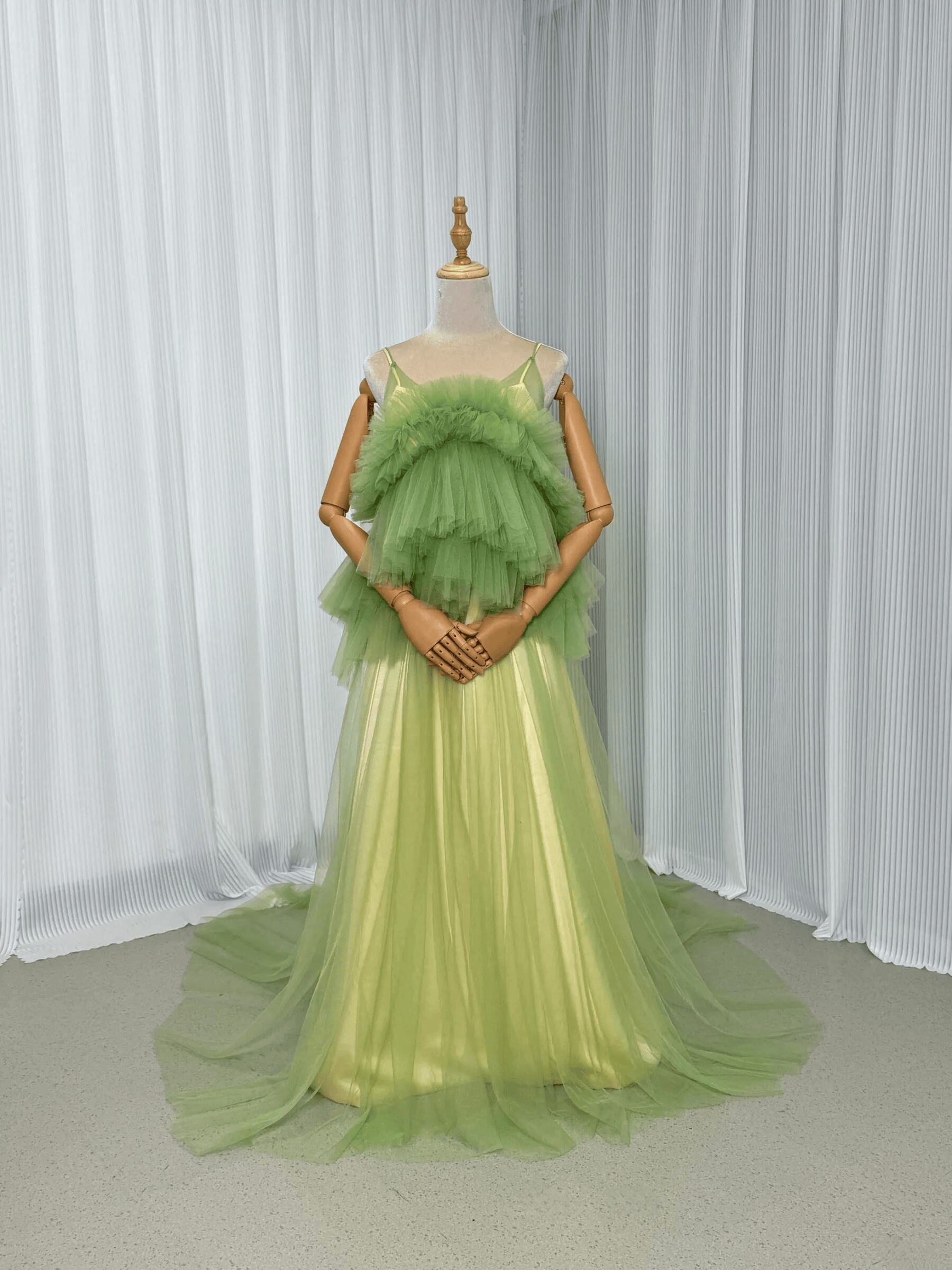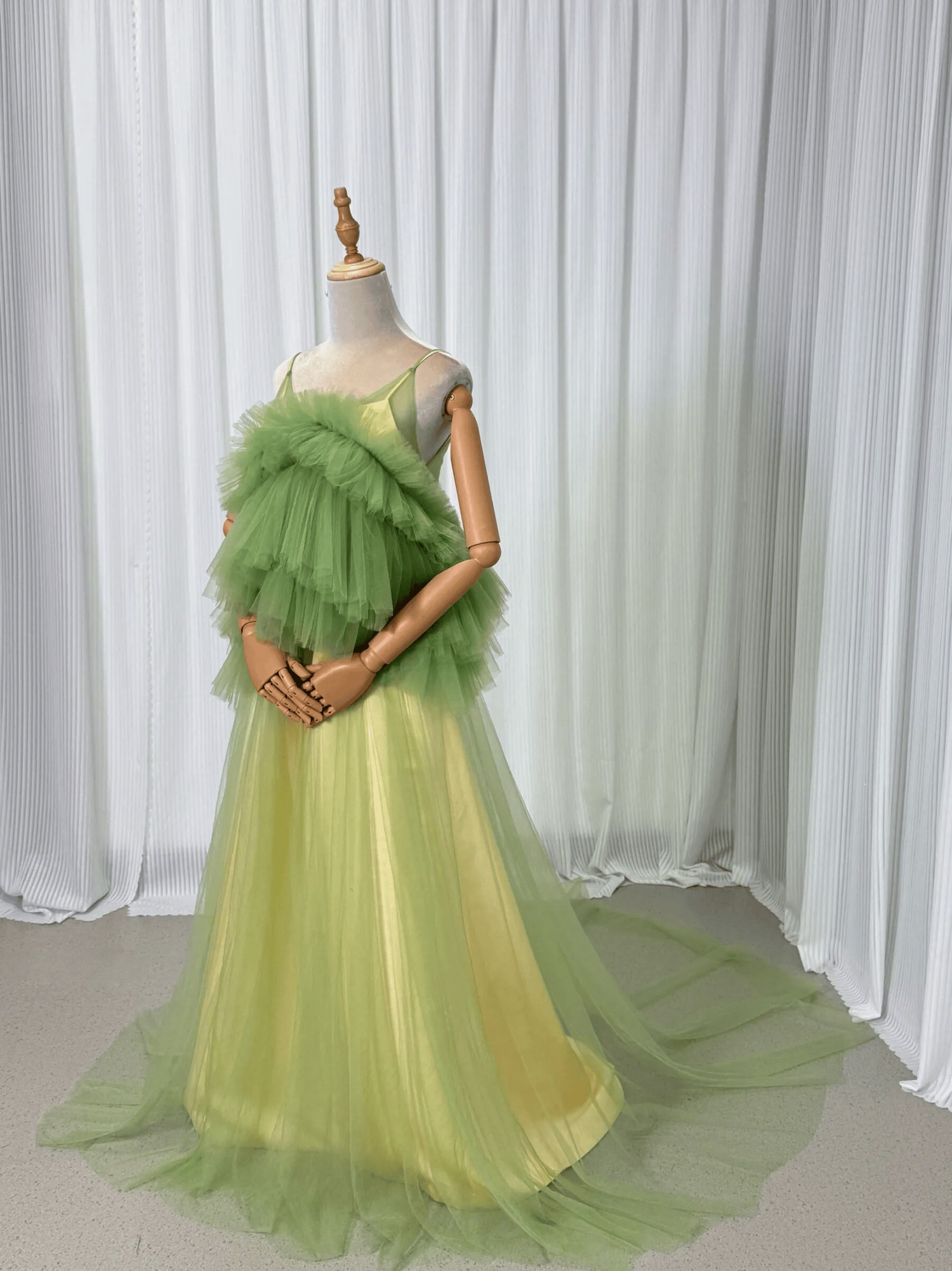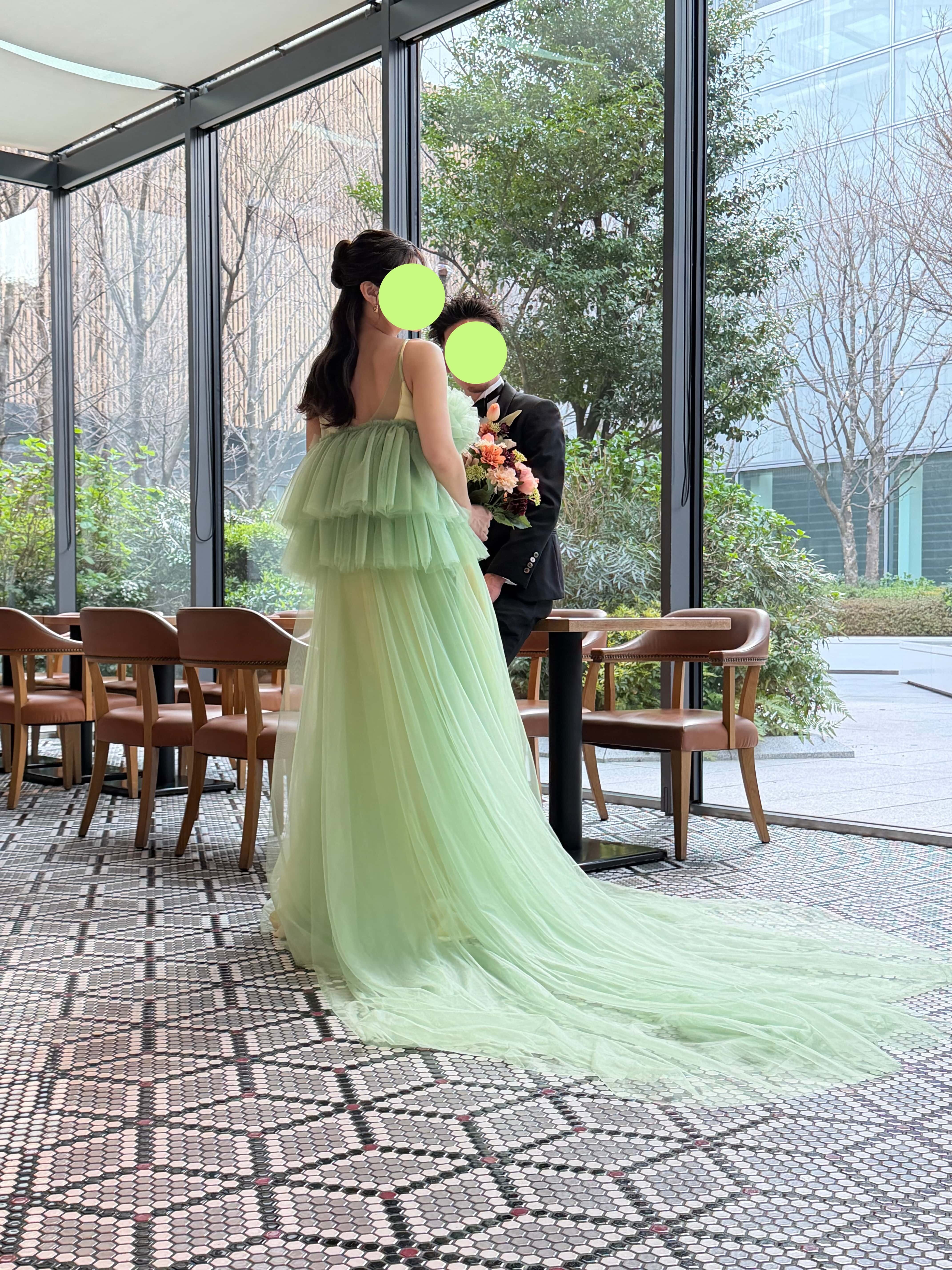 実例写真! カラードレス グリーン キャミソール ソフトチュール ツーピース トレーン 花嫁 前撮り