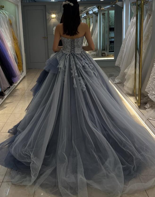 カラードレス ブルー グラデーションドレス 花柄モチーフで刺繍が美しい 編み上げ ソフトチュール 花嫁 演奏会/音楽会