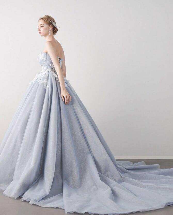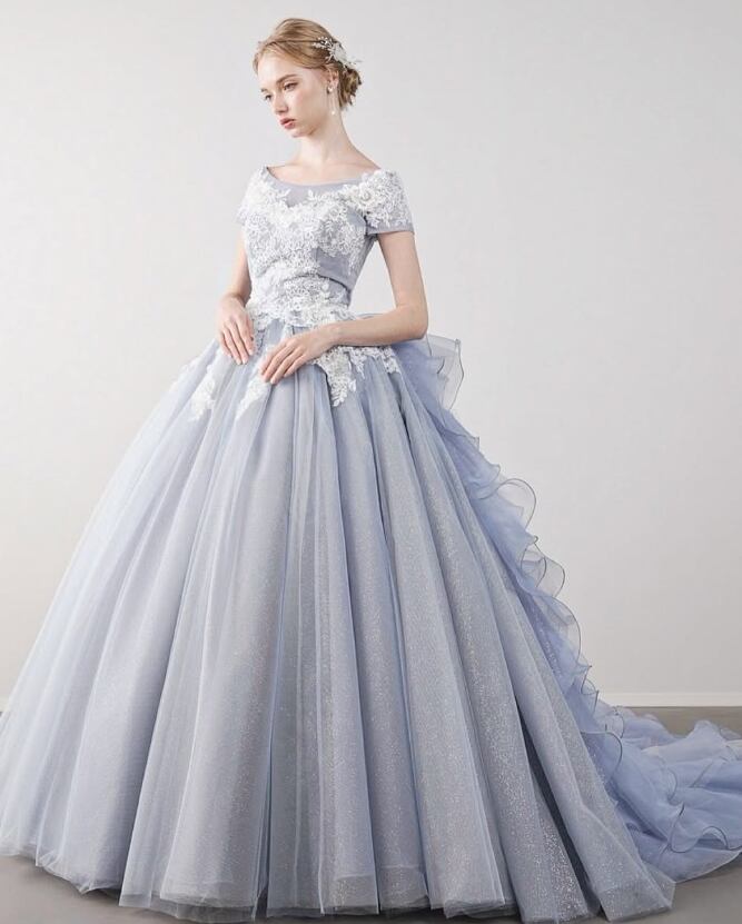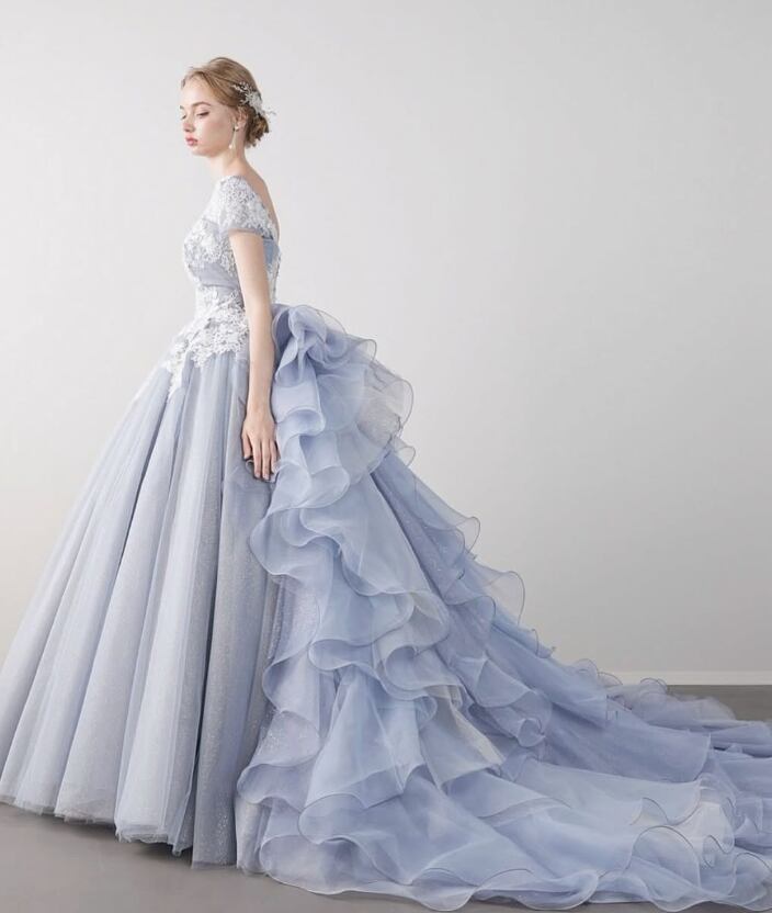 カラードレス 爽やかで優しいブルー 花柄モチーフで刺繍が美しい 取り外し可能な襟 編み上げ 華やかなトレーン ラッフルフリル 花嫁
