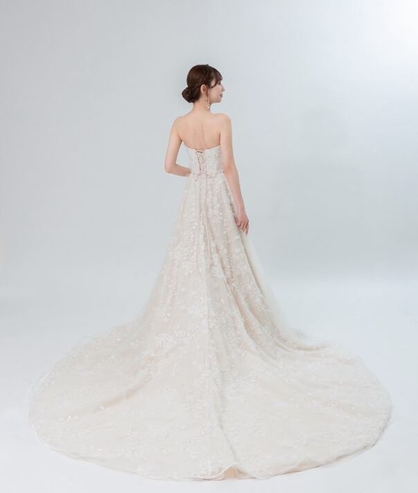 ウエディングドレス オフホワイト ビスチェドレス 精緻な刺繍 編み上げ 華やかなトレーン アンティークなドレス 結婚式