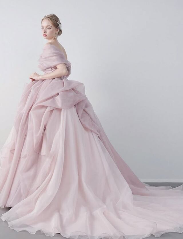 カラードレス ピンク 取り外し可能なオフショルダー 上質オーガンジー レイヤードドレス 華やかなトレーン 花嫁