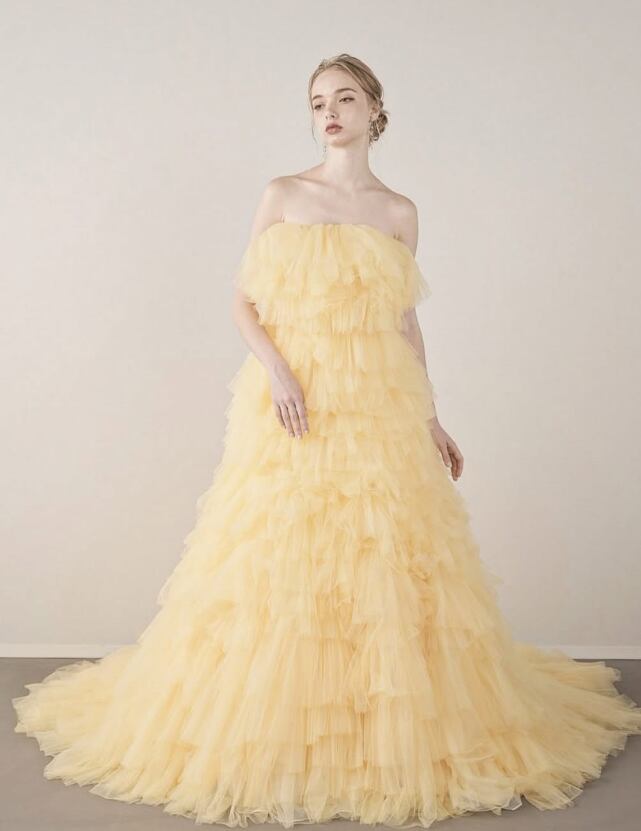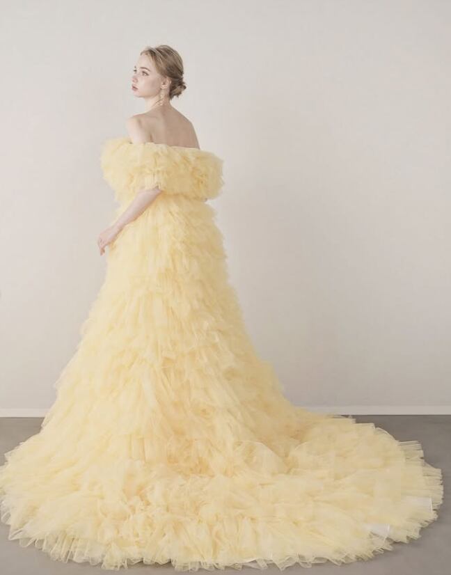 カラードレス パステルイエロー オフショルダー もこもこドレス 柔らかく重ねたチュールスカート ロングトレーン 花嫁