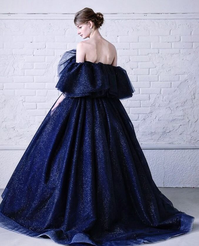 カラードレス ネイビー 2WAYの着方 取り外し可能なオフショルダー シークインチュール 绮丽な 華やかなトレーン 花嫁 演奏会/音楽会