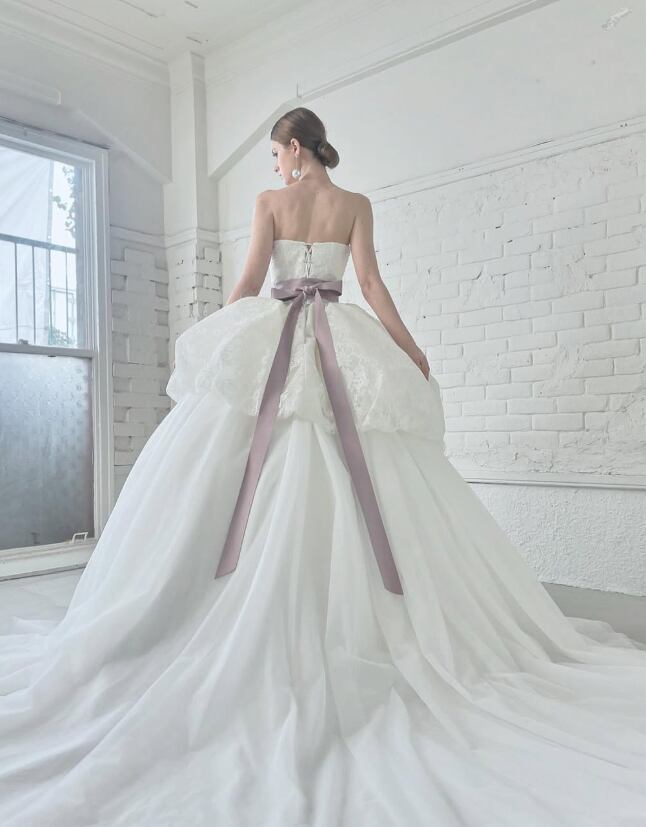 ウエディングドレス オフホワイト サッシュベルト 編み上げ レイヤードドレス 華やかなトレーン ビスチェドレス ブライダル