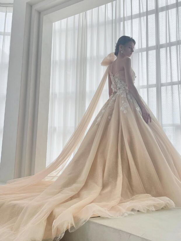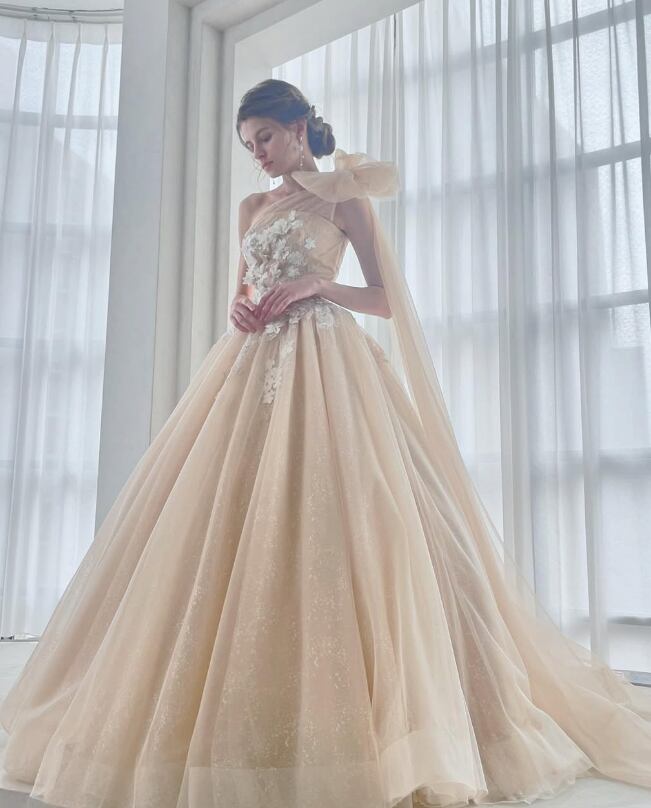 カラードレス あんず色 ショルダー型 花柄モチーフで刺繍が美しい シークインチュール 華やかなトレーン 結婚式 演奏会