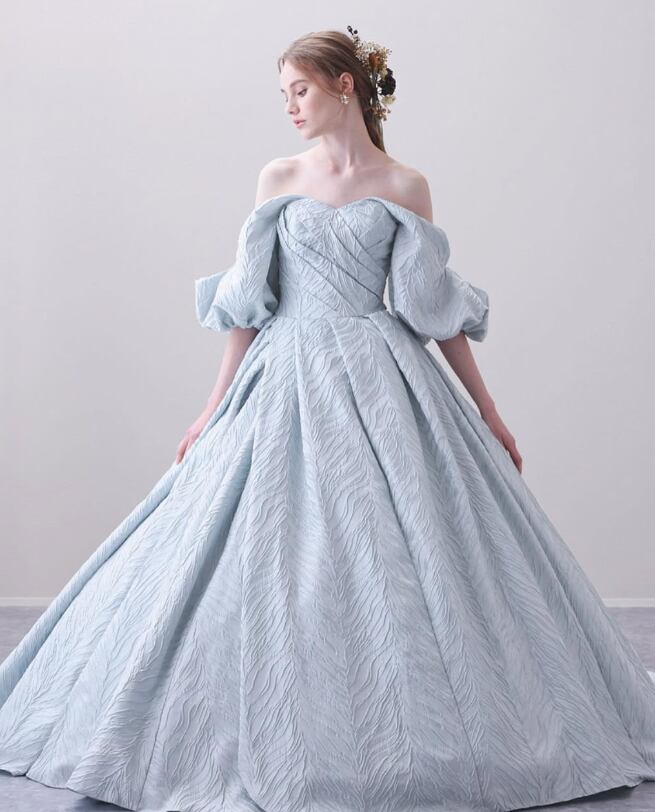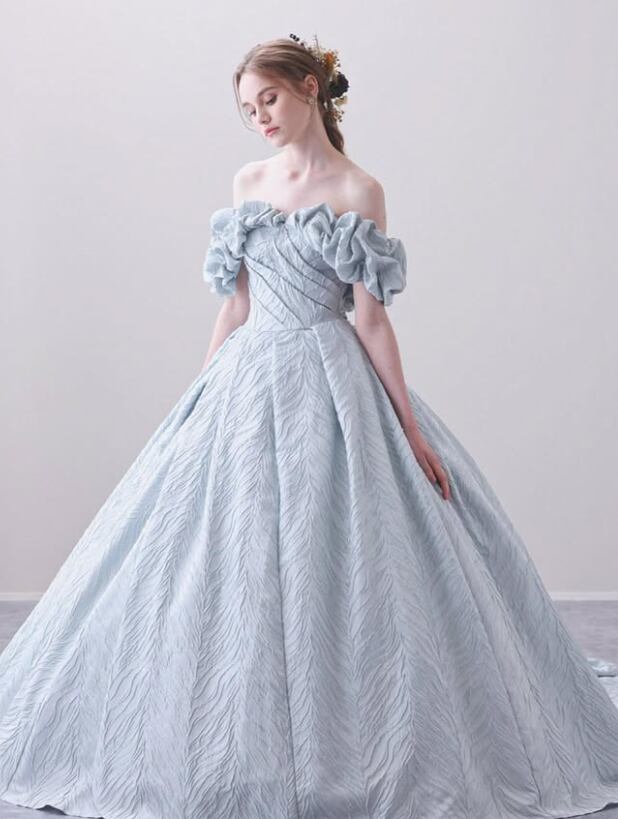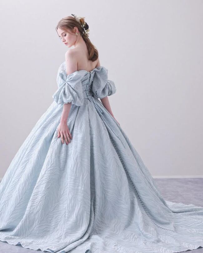 カラードレス 爽やかで優しいブルー ジャガード生地 3WAYの着方 編み上げ 華やかなトレーン 花嫁 前撮り