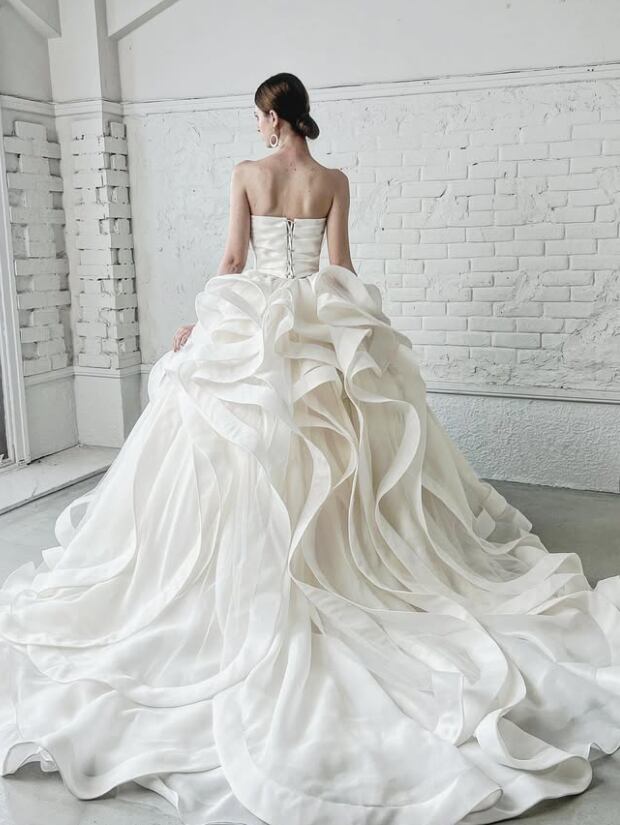 ウエディングドレス オフホワイト ラッフルフリル ビスチェドレス 編み上げ 華やかなトレーン ブライダル